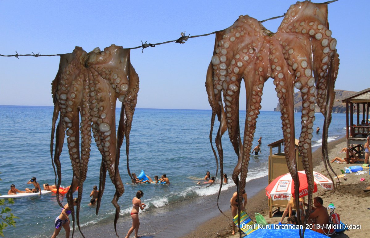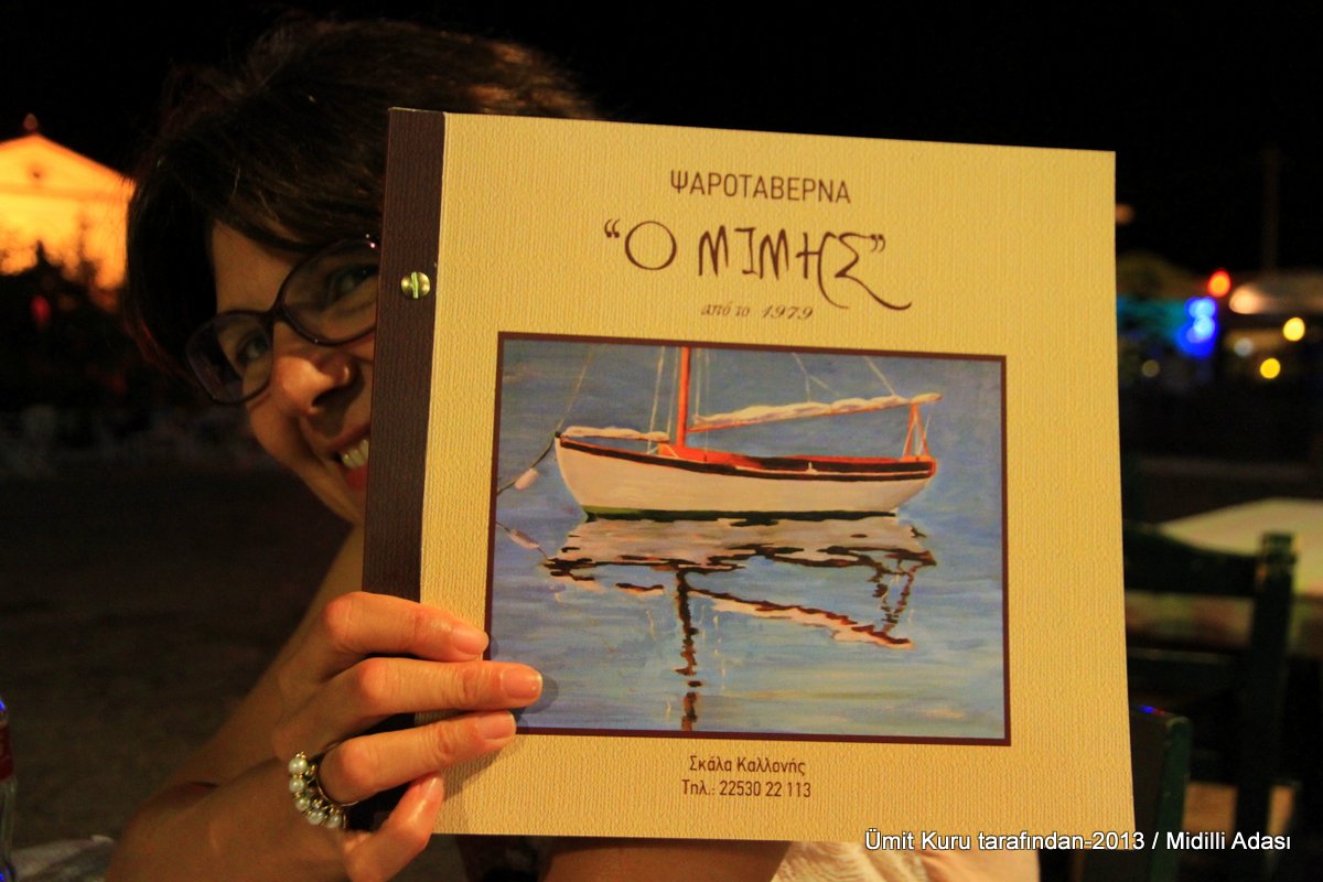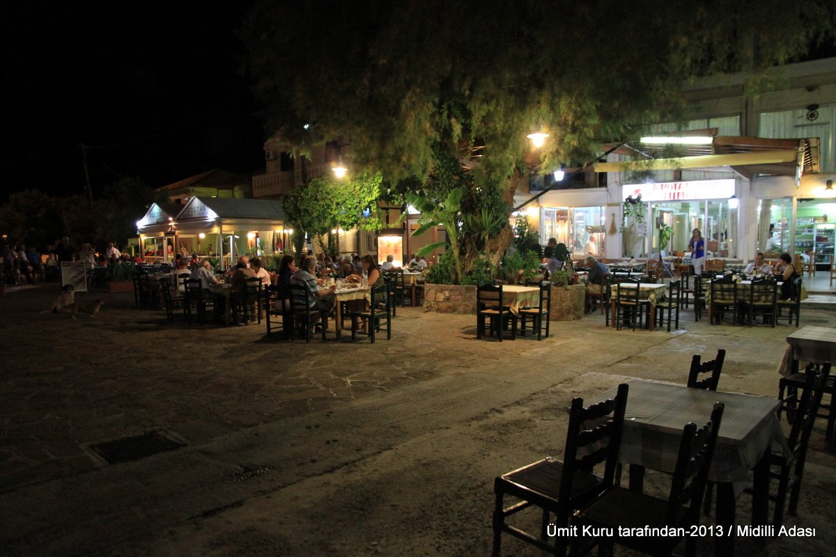 Akşama doğru otele döndük ve tekrar yemek için Kalloni meydanına geldik. Bu sefer Mimis restorantta karar kıldık. Burası sahilde değil ancak tam meydanda. Geceleri meydan daha bir hareketli oluyor. Çoluk çocuk hemen tüm Kalloni halkı burada oluyorlar. Mimis restoranda Dimitri ile dost olduk. 74 Yaşında olduğunu öğrendiğimiz Dimitri’nin büyük dedeleri Uşak-Türkiye’den Midilli’ye göç etmişler. Yaşından beklenmeyecek bir görünüşte ve çeviklikte olan Dimitri’nin kurduğu sofranın yeni tadı ise musakka oldu. Doğrusu bizdeki musakkadan çok daha güzel yapılmış yemekti. Soframızda Uzo’da eksik değildi. Tarihi Bizans’a, Arabistana dayanan ve bizdeki rakının karşılığı olan Uzo’yu daha önceki denemelerimde çok sevmemiştim. Ancak burada fark ettim ki her bir Uzo’nun farklı bir tadı var. Burada ilk olarak tattığım “Barbayani” marka Uzo’yu çok beğendim. Her ailenin Uzo’suna kattıkları aromatize bitkiler farklı olunca Uzo’ların tatları da farklı oluyor tabii ki.