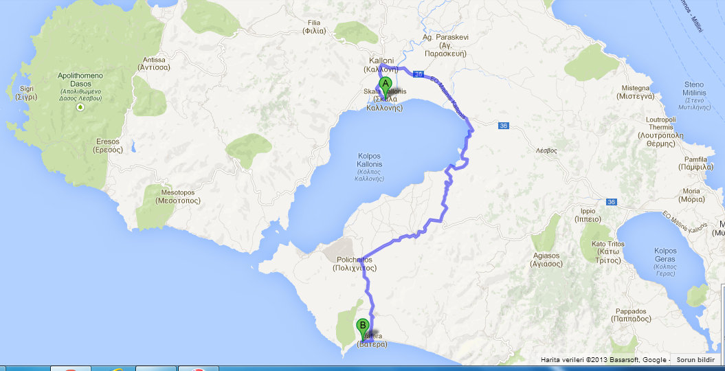 Kaldığımız yerden Vatera Plajına kadar 45 km kadar yolumuz var. Yollar düne göre daha iyi ama yine dar ve az da olsa virajlı. Kalloni’den çıktıktan sonra nehirlerin oluşturduğu sulak alanlarda ve tuzlalarda göçmen kuşları görebiliyorsunuz. Kalloni’den çıktıktan sonra yaklaşık 10. km’de Polichnitos sapağı var. Bunu kaçırmamanız gerekiyor, yoksa yolun devamında kendinizi Mytilini’de bulma şansınız var.