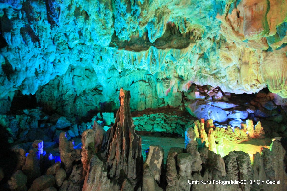 Yemek sonrası ilk ziyaret yerimiz Reed Flute Mağarası (ludi Yan), bölgede bolca bulunan mağaralar içinde en önemli olanlarından bir tanesi. Bu mağara Guilin halkının 1940’daki Japon istilasına karşın saklanmış oldukları mağaraymış. Milyonlarca yıl önce oluşan ve oluşumu hala devam eden sarkık ve dikitlerden oluşan mağara içinde çok güzel ışık oyunları yapılmış. Mağara 10 metre genişlik ve 500 mt kadar da derinliğe sahip. Buraya gelmişseniz mutlaka bu mağarayı gezmeniz gerekiyor derim.