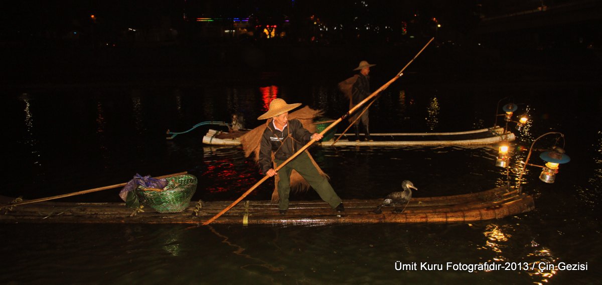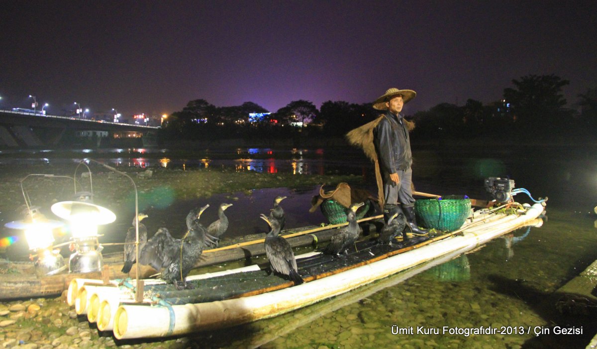 Buraya gelmeden önce, Guilin’de evcilleştirilmiş karabataklarla balık avlayan balıkçıların gösteri yaptığını ve izlemenin mümkün olduğunu okumuştum. Sevgili Can’a bu gösteriyi izleme isteğimizi belirttim ve onlarda bu gösteriye gidişimizi ayarladılar. Bu gösteri adam başı 100 Yuan’a mal oluyor. Avladıkları balıkları, balıkçıların boyunlarına bağladıkları ip nedeni ile yutamayan ve onları balıkçıya getiren karabataklar bunlar. Balıkçı, karabatağın kursağındaki balığı kusturuyor ve karabatağı yeniden avlanmaya gönderiyor. Bizim izlediğimiz, adı üstünde bir gösteri. Karabataklar, büyük olasılıkla teknenin önünden bir görevli tarafından nehre atılan ölü balıkları avlıyor ve balıkçıya getiriyor. Yine de izlemesi zevkliydi. Çünkü bu sistemle balık avı hala yapılıyor. Burada sadece balık baştan ölü!