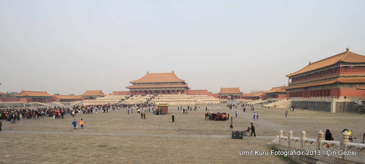Hall of Supreme Harmony yerden 30 mt kadar yüksekte ve bina kocaman bir avlunun içinde olup, çok güzel mermer merdivenlerden çıkılıyor. Mermer merdivenlerden ortadaki en çok gösterişli olanı ve yine sadece imparatora ait olan merdivenmiş. Bu bina evlenme ve taç giyme gibi çok önemli olaylar için kullanılırmış. Bu salonun önüne geçip te taht bölümünün fotoğrafını çekmem mümkün olmadı. Ben bir omuz attım öne geçeyim diye, iki omuz yedim geriye düştüm. O kadar kalabalıkla 10 dakika uğraştımsa da sonunda yenilgiyi kabul ettim. Sadece yandan çekebildiğim birkaç kare ile yetindim. İmparator tahtına yakın olan 6 sütun altınla kaplıymış ve tüm alan ejder motifi ile çevriliymiş. İlk defa 1406 yılında Ming Hanedanlığı döneminde yapılan salon Qing Hanedanlığı döneminde 7 kez yangın geçirmiş ve en son hali 1695-1697 tarihleri arasında yapılmış.