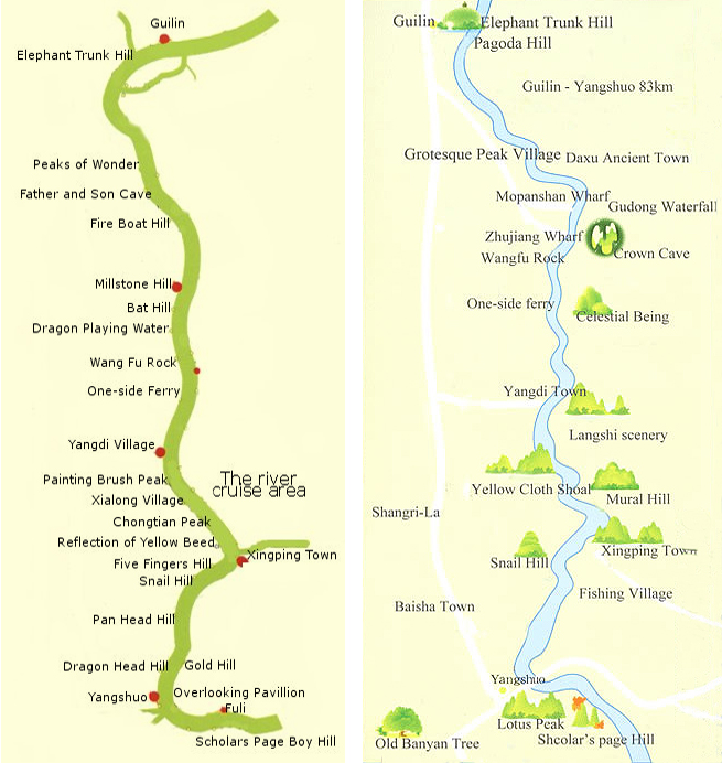 İlk bölüm olan Guilin’den Ox Gorge’a (Öküz Boğazı) kadar olan kısımda sırası ile ;