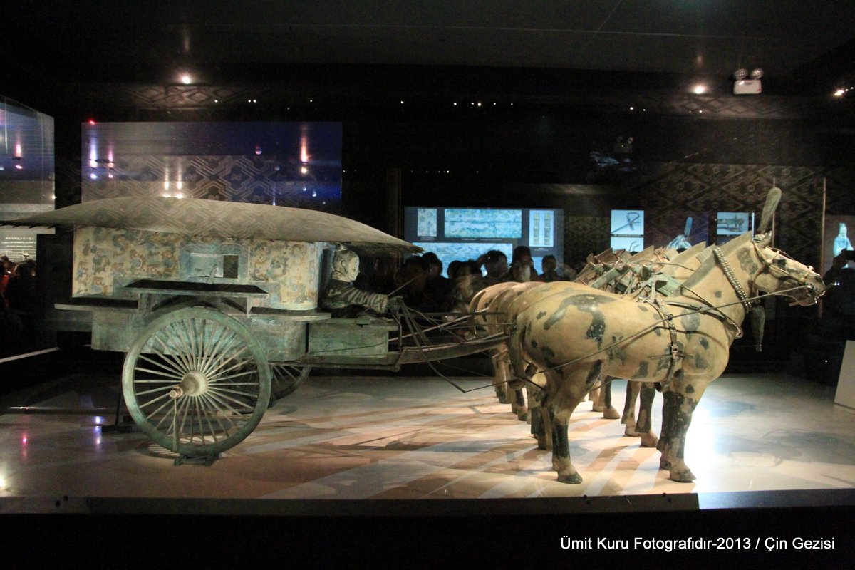 Müze girişine varınca önce elektirikli arabalarla müzeye götürürüldük. Bu müze 3 kısımdan oluşuyor. Aslında kazı alanının üstüne müze yapmışlar. Bir taraftan da hala kazılara devam ediyorlar. Müze 3 bölümden meydana geliyor. Birinci bölümde 2 tane atlı arabanın heykeli var. Bu arabalardan ön tarafta olanında imparatorun koruması olan süvari arabası var. Diğeri ise imparatorun arabası. Bu eserler Dünya Külltür Mirası içinde olanlar. Aslında askerler dahil tüm eserler boyalıymış ama gün ışığına çıkar çıkmaz boyalar vernikli olduğundan hemen dökülüyormuş. Bu nedenle bu soluk gri olan heykelleri canlı renkleri ile hayal etmek müthiş bir şey.