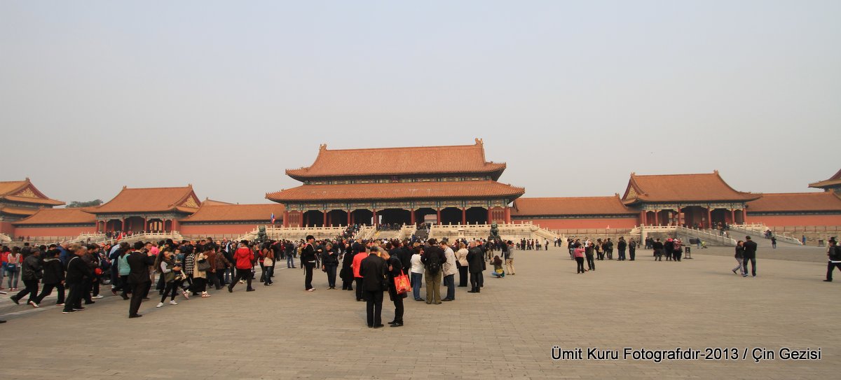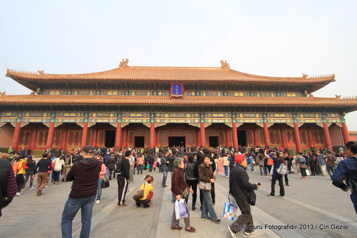 Hall of Supreme Harmony yerden 30 mt kadar yüksekte ve bina kocaman bir avlunun içinde olup, çok güzel mermer merdivenlerden çıkılıyor. Mermer merdivenlerden ortadaki en çok gösterişli olanı ve yine sadece imparatora ait olan merdivenmiş. Bu bina evlenme ve taç giyme gibi çok önemli olaylar için kullanılırmış. Bu salonun önüne geçip te taht bölümünün fotoğrafını çekmem mümkün olmadı. Ben bir omuz attım öne geçeyim diye, iki omuz yedim geriye düştüm. O kadar kalabalıkla 10 dakika uğraştımsa da sonunda yenilgiyi kabul ettim. Sadece yandan çekebildiğim birkaç kare ile yetindim. İmparator tahtına yakın olan 6 sütun altınla kaplıymış ve tüm alan ejder motifi ile çevriliymiş. İlk defa 1406 yılında Ming Hanedanlığı döneminde yapılan salon Qing Hanedanlığı döneminde 7 kez yangın geçirmiş ve en son hali 1695-1697 tarihleri arasında yapılmış.
