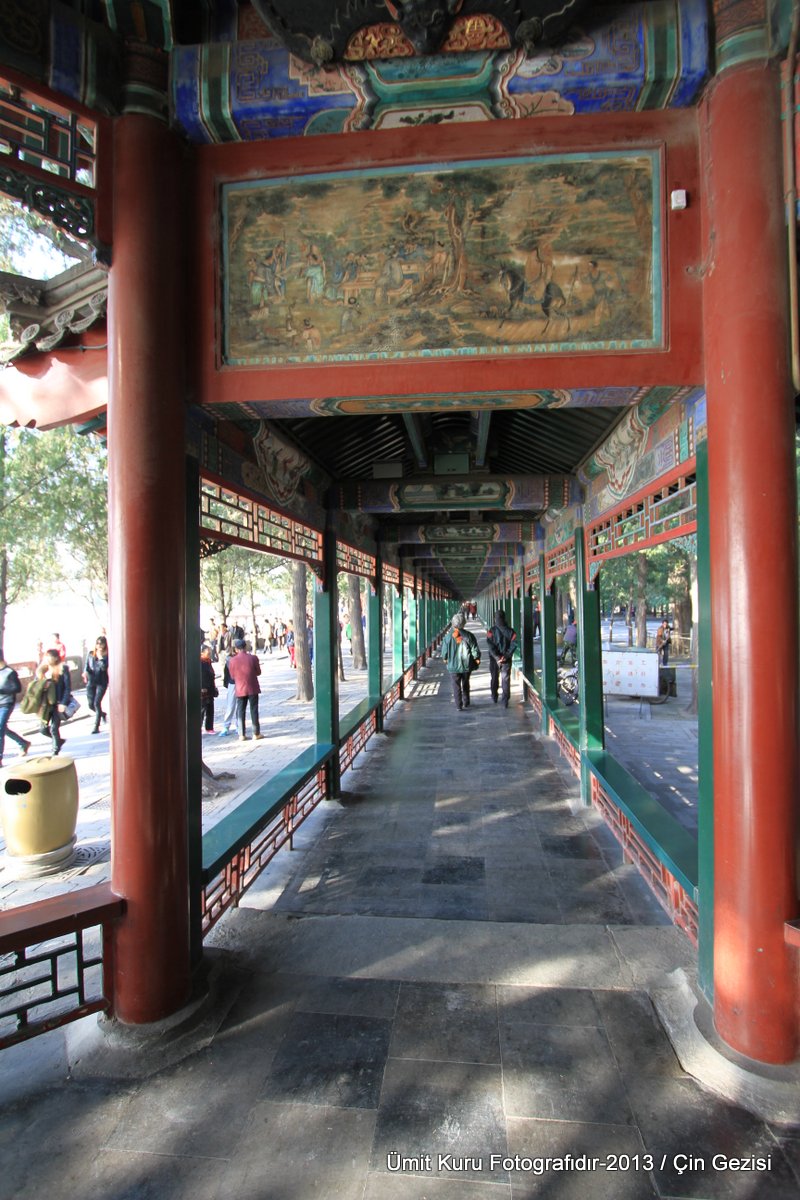 Bu Sarayın en beğendiğim bölümü, 728 metre uzunluğundaki üstü kapalı koridor. Bu koridor dünyanın en uzun klasik Çin koridoru. Koridor ilk bahar, yaz, son bahar ve kış olmak üzere 4 bölümden oluşuyor. Her bölüm arasında birer kulübe var ve ahşap üzerine yapılmış koridor boyunca klasik Çin resimleri var. Bu resimlerin sayısı 30 binden fazlaymış. Yürüyüş yolumuzun sonunda İmparatoriçe Ci xi’ni inşa edilmesi için inat ettiği mermerden gemiye ulaştık ve burada son fotoğraflarımızı çekip, tekne ile başladığımız noktaya geri döndük. Bu gezi bize sabah sabah çok iyi geldi.