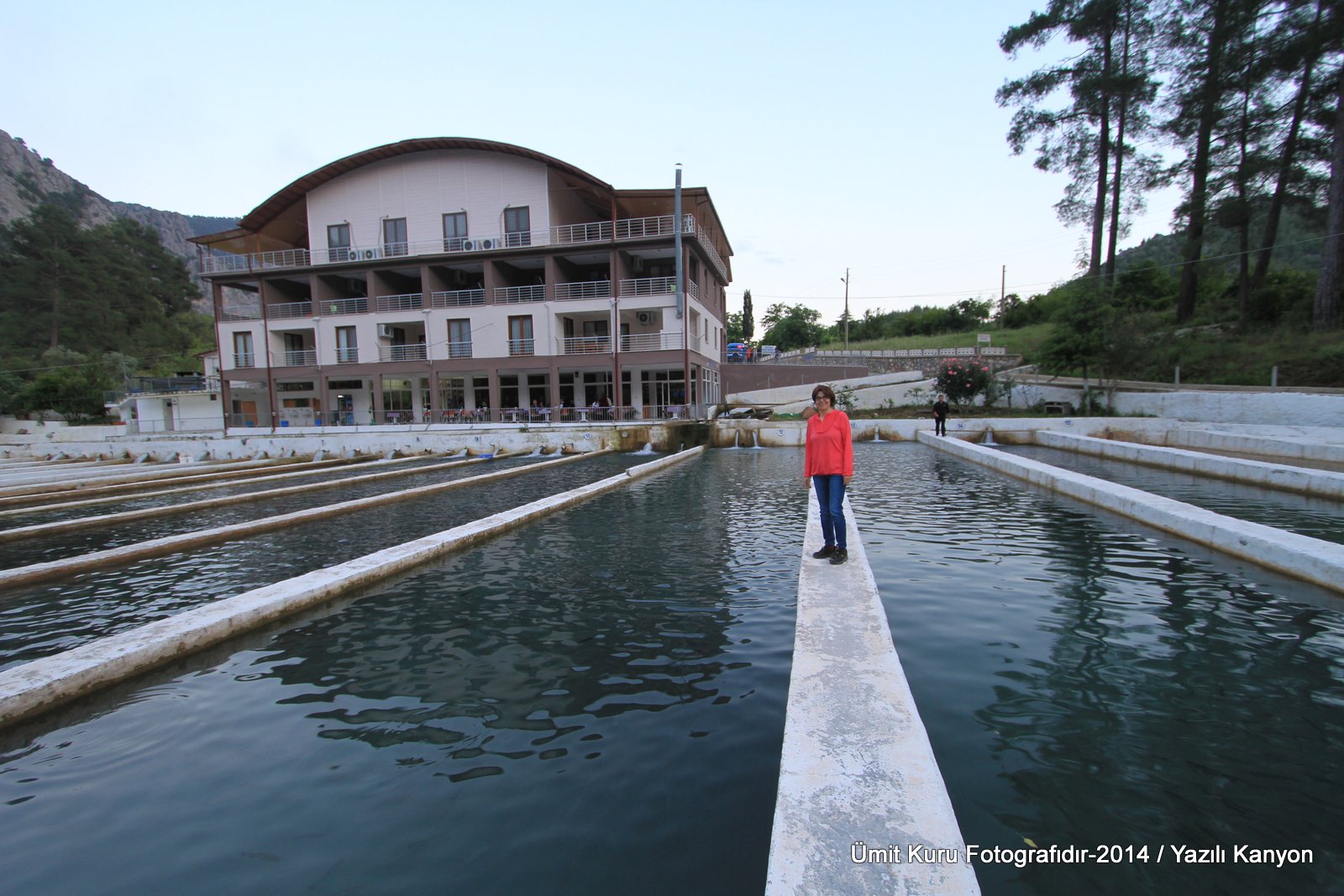Geçen sefer Sütçüler ilçesinde kalmıştık. Ama bu sene, 1989 yılında Milli Park ilan edilmiş, 600 hektar alana sahip Yazılı Kanyon içinde bir alabalık çiftliği olan, Canlar Alabalık tesislerinde kalacağız. Burası Türkiyenin en büyük alabalık tesislerinden ve Yazılı Kanyon içinden akan Göksu Çayının kenarında kurulu bir tesis. Oda sayısı az ama odalar oldukça iyi konumdalar (Canlar Alabalık tesisinde konaklama için Tlf No: 0246 358 61 69. ( tesis sahibi Alim Can) ). Biz hepimiz bu tesisten memnun kaldık. Yemekler genellkle, malum olacağı üzere, alabalıkla sınırlı. Zengin bir kahvaltısı var. Tesise varınca gün ışıkları kaybolana kadar civarı gezmek istedik. Su kenarında bulunan köprüyü geçip su boyunca yukarıya kanyona doğru yürüyüş yaptık. Tesisten Kanyona araçla gitmek isterseniz 1.5-2 km kadar bir yolu kat etmelisiniz. Ancak tesisin hemen yanındaki köprüyü geçip sola doğru yürüyüşe başlanırsa, kanyona 500 mt kadar bir yürüyüşle varılıyormuş. Biz 3 sene evvel Yazılı Kanyon’dan tesislere kadar yürümek istedik ama yol bir yerde suya girmeyi gerektirince geri dönmüştük. Yani çift ayakkabı ile giderseniz, tesisten Yazılı Kanyona doğru yürüyüşte yapabilirsiniz.