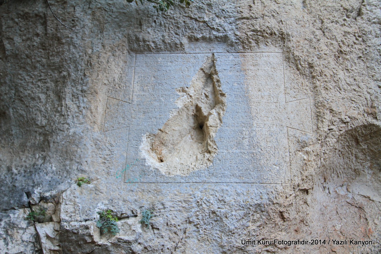 Yazılı Kanyon benim en sevdiğim yürüyüş yollarından birisi. Burayı aynı gün 2 defa yürüdüm. Yazılı Kanyon girişinden sonra 2 yoldan yürüyüşe başlayabilirsiniz. Parkın içinde sola doğru yürüyüp yokuştan çıkarsanız, oldukça taşlık ve dar bir yolla iki adet köprü sonrası Epiktetos’un şiirinin bulunduğu taş levhaya ulaşırsınız. Bu levhayı vandal bir vatandaş, arkasında define var diye kazmaya kalkmış. Dolayısı ile neredeyse 1950 yıllık olan yazıt ağır hasarlı. Ne yazıktır ki bu insanlarla aynı ülkeyi ve toprakları paylaşıyoruz…