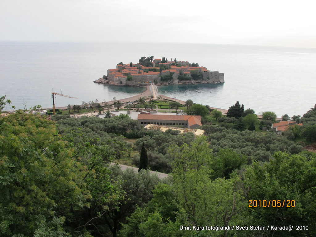 Sveti Stefan, Budva’dan 15 km kadar dışarıda olan aslında bir zamanlar minicik bir yerleşim yeri iken, Sophia Loren ve Carlo Ponti’nin tatillerini burada yapmaları ile ünlenen bir yer. Bir zamanlar küçük bir balıkçı köyü olan bu ada, Ana karaya kısa ve dar bir yolla bağlanmış ve şimdilerde Japonlar burayı tamamen satın alıp otel yapıyorlarmış. Buraya ziyaret yok, bu nedenle biz tepeden bakıp, fotoğraflayacağız. Buradan gün batımı da çok güzel oluyormuş. Gittiğimiz saat çok uygun ama bulutların ardındaki güneş yüzünü hiç de göstereceğe benzemiyor. Bol bol fotoğraflayıp, kalacağımız otele yerleştik.