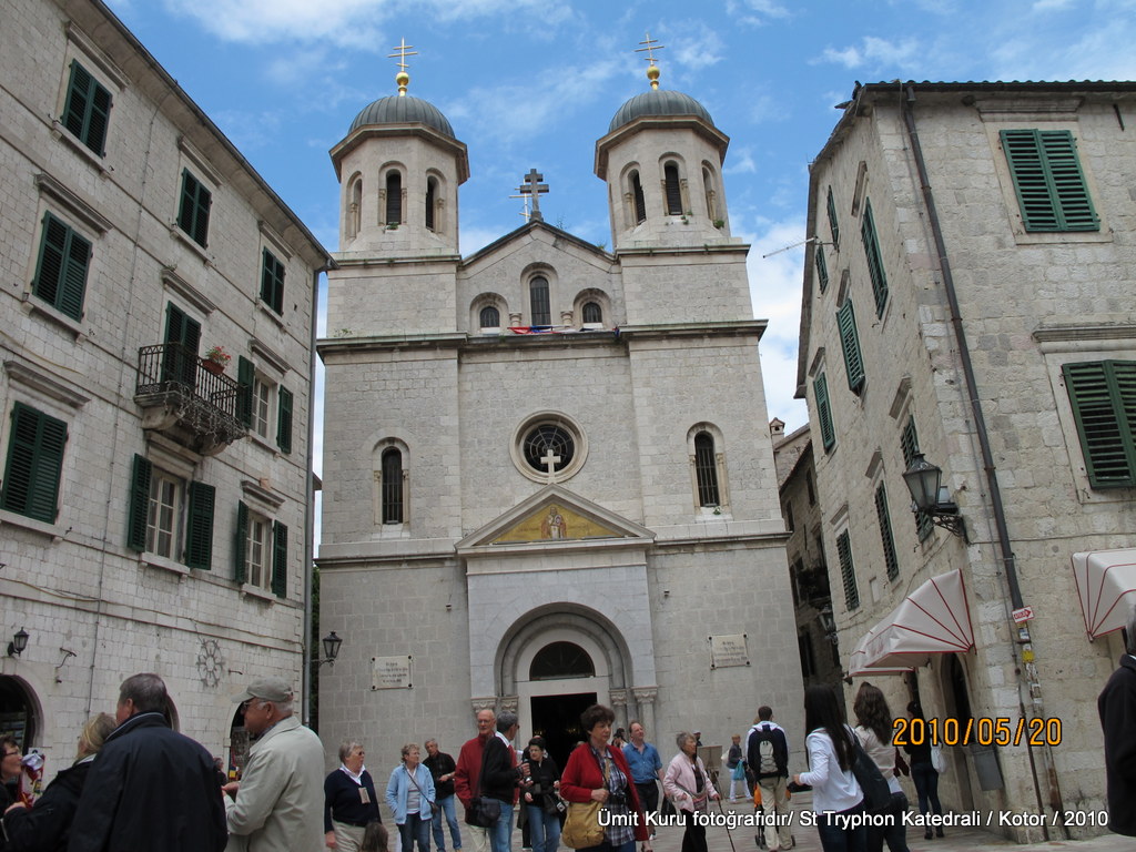 Şehre deniz kapısından girdik. Şehre girdikten sonra karşınıza gelen alan (Oruzia) şehrin en işlek yeri ve bir de 1602 yılından kalma saat kulesi var. Şehrin dar sokaklarında hızlıca bir bilgilenme ve gezinti yaptık. İçini gezdiğimiz St Tryphon Katedrali, Kotor şehrinin koruyucu azizi Tryphon için yapılmış olan bir katedralmiş. Yapımı 11 yüzyıla kadar gidiyor ancak depremlerle yıkılmış ve yeniden yapmışlar. Gotik-Romanesk tarzdaki bina içinde, ince sütunların bir araya gelmesi ile tavan desteklenmekte. Yerel rehber bizi St Mary adlı bir diğer kiliseye götürdü. Bizi bu kilisenin kapılarındaki oymaları göstermek istediğini anlattı. Vasko Lipovac adlı bir sanatçı buradaki oymaların bir tanesinde Barbaros Hayrettin’in savaş gemilerini oymuş ve yengilerini anlatmış.