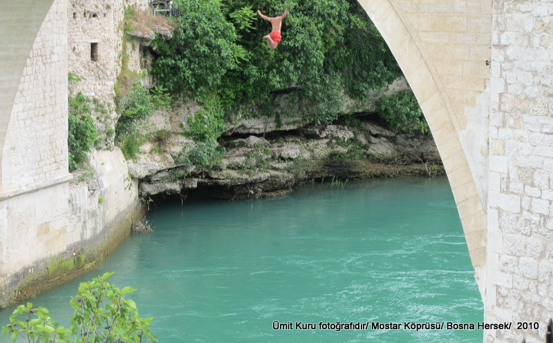 Mostar Köprüsü civarında çok sayıda kafe var. Bunları geçip köprünün üstüne doğru yürüdük. Şortları ile bazı gençler köprünün korkuluklarına çıkıp atlarmış gibi yapıyorlar. Bugünlerde bu gösteri turistler için parası karşılığı yöre gençleri tarafından yapılıyor. Ancak eskiden gelen bir geleneğe göre şehrin erkekleri nişanlılarına cesaretlerini ispatlamak için düğün öncesinde köprüden atlarlarmış. Bugün bu iş Euro karşılığı yapılıyor. Atlamanın bir stili var tabii ki. Gençler 25 mt yükseklikten, çok da derin olmayan bir derinlikteki Neretva Nehrine, tehlikeli sayılabilecek bir atlayış yapıyorlar. Bunun için ayaklar karına doğru iyice çekilip, tam suya değecekleri zaman açılıyor.