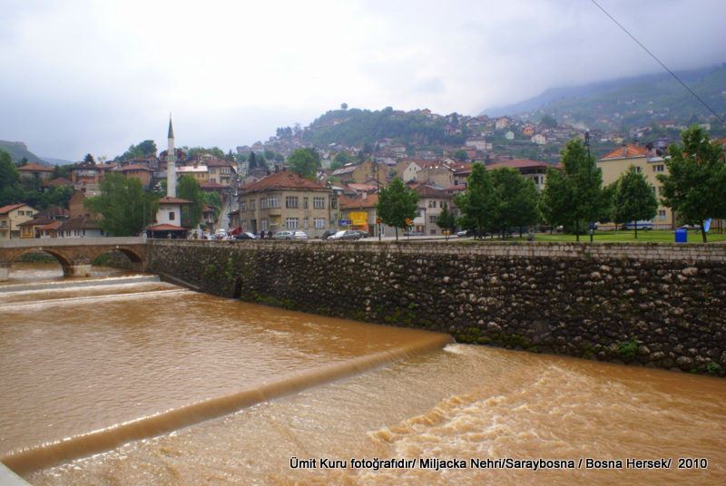 Saraybosna da ki son günümüzde yağmur bizi yalnız bırakmadı ama bu sefer insaflı bir yağmura yakalandık. Otobüsümüz bizi Miljacka Nehri’nin kenarında, Ulusal Kütüphane’nin yanında bıraktı. Miljacka Nehri, Neretva’nın bir kolu ancak Neretva Nehrinin güzelim yeşil renginden eser yok. Neredeyse kahverengi akıyor, belki yağmurdan dolayı, belki de kirden (ama koku filan almadık).