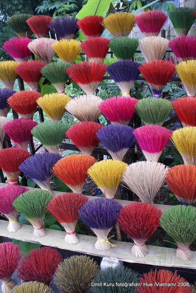 Tüm Vietnam’da tütsü yakılıyor. İlla da tapınakta olması şart değil. Hatta sokakta bile yakılıyor. İlginçtir, akşamları dükkanlarını kapatırken özellikle Amerikan Doları yakıyorlar ve tütsü bırakıyorlar. Bunda amaç bereket için duanın yanında, ölmüş ataları için öbür dünyada gerekli parayı tedarik etme ihtiyacını hissetmeymiş. Kendi para değerleri düşük olunca, ABD Doları ile enflasyona karşı korunma gereksinimi, öbür dünya için bile hissediliyor demek ki. Bunu araya sokmamın nedeni Tu Duc’un mezarı sonrası tütsü yapan bir köyden geçtik. Rengarenk tütsüler tezgahlarda çok hoş duruyorlar