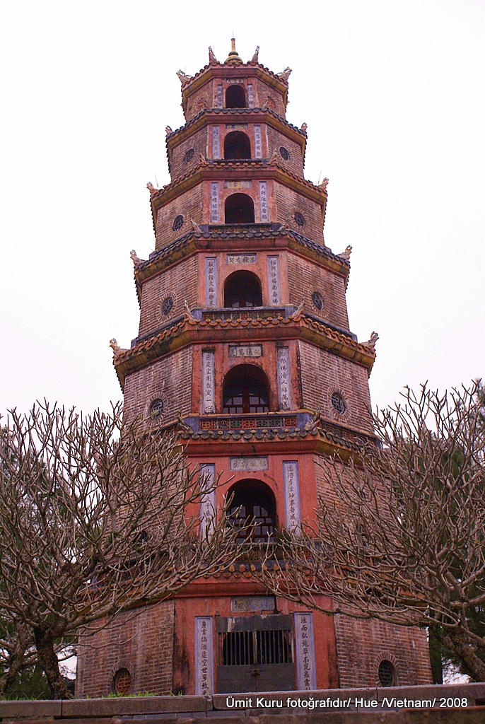 Bu arada Pagodanın ne anlama geldiğinden biraz bahsedelim. Pagoda Budistlerin dinî yapılarına verilen bir ad ve taştan, bazen tuğladan ve çok nadir olarak da tahtadan yapılıyor. Pagodalar, Çin, Japonya ve Hint kültürü alanına giren Güneydoğu Asya’da yaygınlar. Bazen yuvarlak, fakat genellikle dört ya da daha fazla kenarlı bir temel üzerine oturtulan yapı, daralarak yükseliyor. Bir pagodanın kat sayısı 5 ile 13 arasında değişiyor. Bizim Thien Mu Pagodası 7 katlıydı. Üzerlerinde çepeçevre bir saçak bulunan bu katlar Tanrıların gök katlarını temsil ediyor. Pagodaların din alanındaki önemi Buda’nın kalıntılarının korunduğu yerler olması. Pagodaların asıl kökeni Hintlilerin Stupa adını verdikleri dinî yapılar. Stupalar kral mezarlarının ve kraldan kalanların güven içinde bulunduğu kutsal yerler. Stupalara Seylan’da Dagoba adı verilirmiş. XVI. yüzyılda Hindistan’a giden Portekizliler burada gördükleri dagobaların adını değişik telâffuz etmişler ve pagoda demişler ve bu ad zamanla yaygınlık kazanmış, olmuş sana Pagoda!