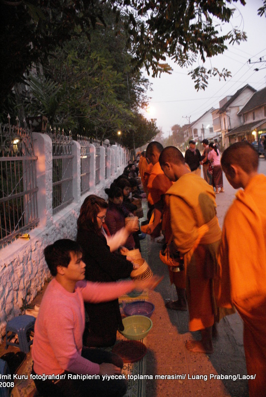SONY DSCLuang Prabang’da ikinci günümüze uyandık. Sabah erkenden kalkıp, keşişlerin dilenme kapları ile halktan topladıkları yemek bağışları törenini seyretmek istiyorum. Dün geceden saati 05:00 kurdum, ama saat çalmadan uyandım. Balkondan sokağa baktım, hiçbir hareketlenme yok. Yerel rehber bizim kaldığımız otelin hemen başında bu törenin (aslında normal ve her gün tekrarlanan bir olay, ancak bizim için tören anlamı taşıyor) gerçekleştiğini ve saat 05:30’da sokakta, köşede olmamız gerektiğini söylemişti.