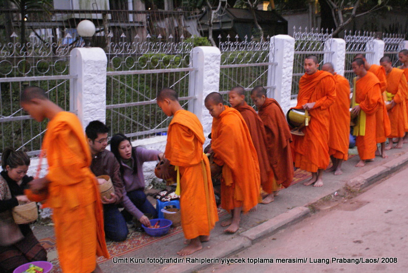 SONY DSCBu arada bu tören hakkında öğrendiklerimi aktarayım; keşişler sadece sabah ve öğle yemeklerini yiyorlar. Akşam yemeği yemiyorlarmış. Sabahları ellerinde yemek kapları ile manastırdan sokağa çıkıp, kendilerini bekleyen halkın önünden geçerek, kaplarına yemekleri bırakmasına izin veriyorlar. Kapları dolunca da manastıra geri dönüp, yemekleri ortaya koyarak paylaşıyorlar. Manastıra keşiş olarak sadece erkekler girebiliyor. Manastıra ilk giren keşiş en küçük rütbeden başlıyor. Manastırda işler hep birlikte yapılıyor. Sabah yemek toplama alanının karşısındaki tezgahlarda hazırda yemekler ve meyvelerde satılıyor. İsterseniz buradan satın alıp, keşişlere bağış yapma şansınızda var. SONY DSCDönelim bizim törene; giyinip aşağıya indim. Sokağın başına gidip, keşiş aramaya başladım. Ancak ortalıkta kimseler yok. Sadece benim gibi birkaç turist ve el arabaları ile yemek satıcıları var. Yemek satıcılarını görünce doğru yerdeyiz dedim. Saat 06:15 gibi gün daha fazla ışıdı, sayımızda arttı. Bu arada insanların kaldırımda küçük tabure veya kilimlere yerleşmeleri başladı. Yerleşenlerin önemli bir bölümünü, özellikle uzak doğudan, turistler oluşturuyor. Karşı kaldırımda da bizler, ellerimizde fotoğraf makineleri hazır bekliyoruz. Sonunda ileriden tek sıra halinde, turuncu giysileri içinde keşişler gözüktü. Gülme yok, konuşma yok, boyunlarına geçirdikleri dilenme kapları ile kendilerini bekleyen yemek bağışçıları önüne kadar geldiler. Bağışçılar, yemeklerini uzatılan kaba birer kaşık olacak şekilde koydular. Bu işlem sırayla devam etti. Ardından diğer manastırdan çıkan keşişlerde ters taraftan çıkageldiler. SONY DSC SONY DSCKimse kimseye çarpmadan dilenme kaplarını doldurdular ve geldikleri gibi manastırlarına doğru yöneldiler.
