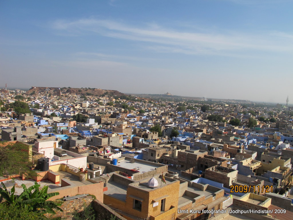 Jodhpur, namı-değer Güneş Şehri ya da Mavi Şehir, Rajastan’ın başkent Jaipur’dan sonraki ikinci büyük şehri. Rao Jodha denen bir Rajput Mihracesi tarafından isimlendiriliyor; tarih 1459. Şehir isimlerinin sonundaki –pur (Jodhpur, Jaipur, Udaipur gibi) veya –abad (İslamabad, Haydarabad  gibi) ekleri şehir anlamında. Aslında bundan öncede yerleşim olan bir alan burası. Daha sonra Moğollar burayı ele geçiriyorlar ancak Rathora ailesinden Mihraceler burayı yönetmeye devam ediyorlar. Tabii ki Moğollara asker ve haraç ödeyerek. Bu beylik Moğollara Maharaja Jaswant Singh isimli kıymetli generaller de vermiş. 1700’lü yıllarda Moğollar zayıflayınca kendi içlerinde savaşlar başlıyor ve sonrasında da 1818 yılında İngilizler bölgede hakimiyet kuruyorlar. 1946 yılında bağımsızlık ilan edilince bu eyalette Hindistan’a katılmayı kabul etmiş. Tüm Rajastan’da hala Raja’lar mallarının  (sarayları, bahçeleri ve diğer taşınmazları) çoğunluğunu  hala yönetiyorlar. Ancak askerleri yok, yönetim güçleri yok. Onlarda Saraylarını 5 yıldızlı otellere çevirmişler. Fiyatları çok yüksek, bu Heritage (Rajaların eski saray otelleri) otellerde kalmayı çok istedim ama tur fiyatını çok arttırınca kalamadık.