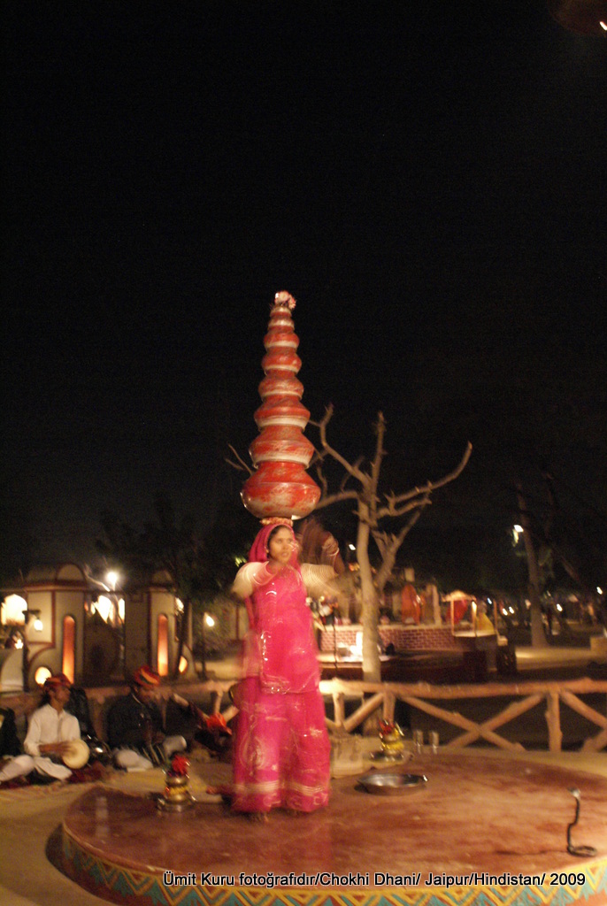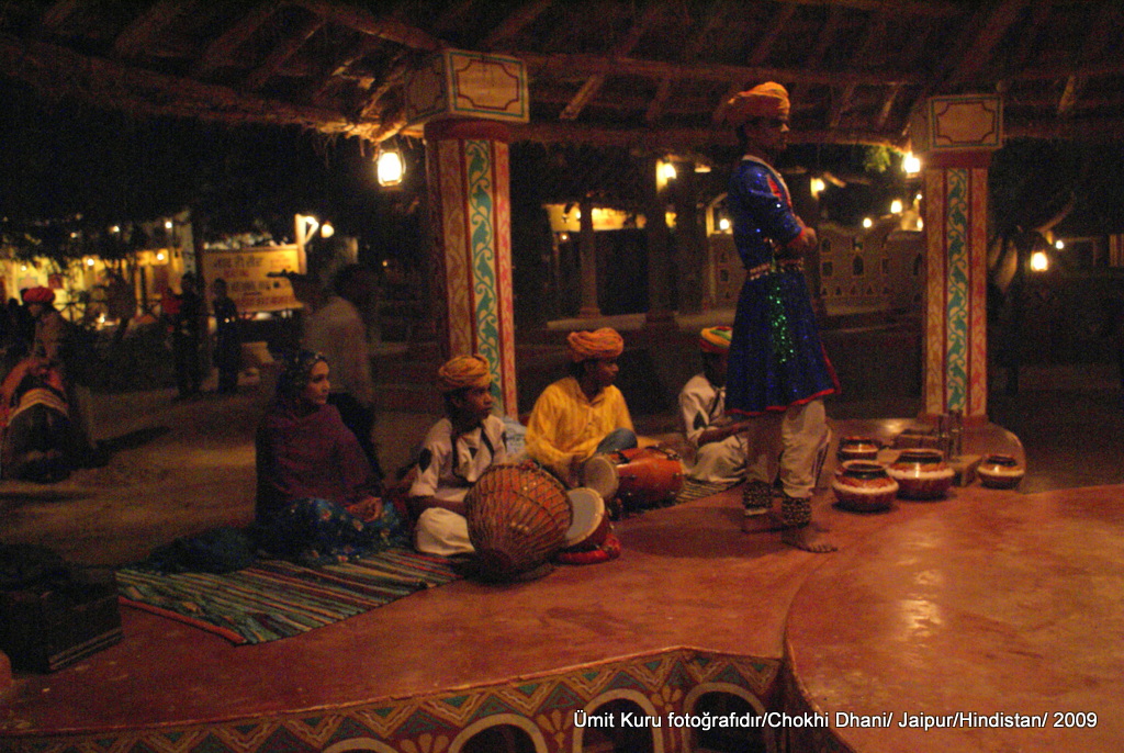 SONY DSCSonrasında otelimize döndük. Ancak akşama da aktivite var; Chokhi Dhani denen yerde akşam yemeği yiyeceğiz. Burası Jaipur merkezin,n biraz dışında bir yer ve Rajastan Folklorik gösterileri, kukla ve yılan oynatıcıları, erkek dansçıları ile bir tür konaklamalı turistik tesis. Biz İstanbul’dan tur aracılığı ile adam başı 20 USD vererek ayarlama yaptık. Kendimiz oradan gitseymişiz 650 Rupee ye iş bitecekmiş. Bu fiyata yemek dahil. Ama kendimizin de şehir dışında olan bu yere gitmesi pek kolay değildi. Onun için helal ettim. Dans gösterilerinin, Jodhpur’da izlediğimiz gösteriden bir üstünlüğü yoktu ve hatta oradaki daha da güzeldi. Ancak burada yediğimiz yemek Rajastan yemeklerinin en iyi örneklerinin bir sunumuydu. İçeride anne, baba ve çocuktan oluşan bir gruptan yerel şarkılar dinledik. Güzel bir gün sonu oldu. Bugün de dört dörtlük geçti Daha ne isteriz?