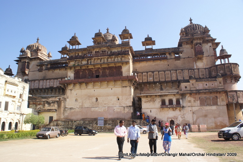 Orchha’da bir rehber bizi karşıladı. Bu rehber İngilizcesi en anlaşılabilir olanı çıktı. Önce sarayları gezmeye gittik. Saraylar daha önce gördüklerimize göre küçük sayılır. Burada hüküm sürmüş olan Bundela Hanedanlığı döneminde yapılmış 3 tane saray var. Bu saraylardan en etkileyici olanı Cihangir Mahal denen saray. Cihangir bu yöreye sefere çıktığında yörenin kralı Cihangir için bir saray yaptırmış. Amaç Şah Cihangir’in hışmından korunmak ve mevcudiyeti devam ettirmek. Şah Cihangir kendisi için yapılan sarayda sadece ve sadece 8 gün kalmış. Bu arada beylikte kurtulmuş. Saray ise av köşkü olarak kullanılmış.