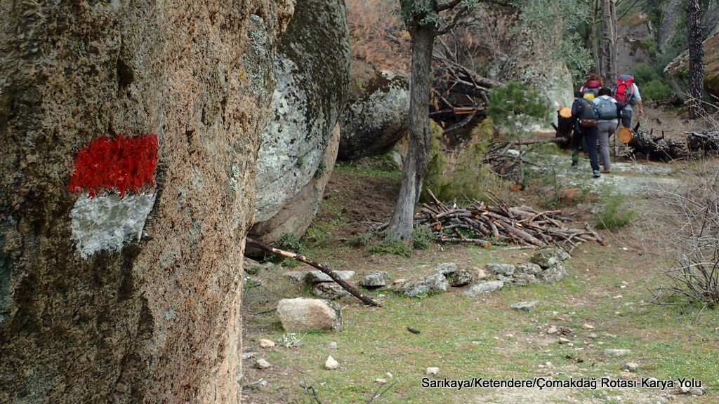 Yürüyüşe Sarıkaya Köyünden başladık. Ülkemizde bulunan diğer uzun yürüyüş rotaları gibi, uluslararası tarzda, kırmızı-beyaz renkleri içeren ve yolun takibini ve yönlendirmeyi sağlayan işaretleri takip ede ede yol aldık. İşaretlere dikkat etmeniz gerekiyor. Standartta işaretlemeler zorlu yollarda daha sık aralıklarla, kolay yollarda ise 200 metre aralıklarla yerleştiriliyormuş. İşaretler genelde taşlar, bazen de ağaçlar üzerinde bulunuyor.