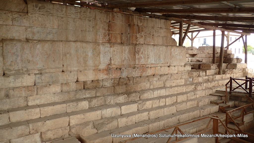 Daha öncekilerde fark etmemiş de olabilirim ama ilk defa buradaki tapınak sütunlarının üstüne kazınmış yazılar görüyorum. Euromos küçük bir alan, burası için kısacık bir zaman ayırmanızı tavsiye ederim. Özellikle amfi tiyatroya çıkan yolda bulunan terastan görünen kuşbakışı tapınak manzarası çok etkileyici.