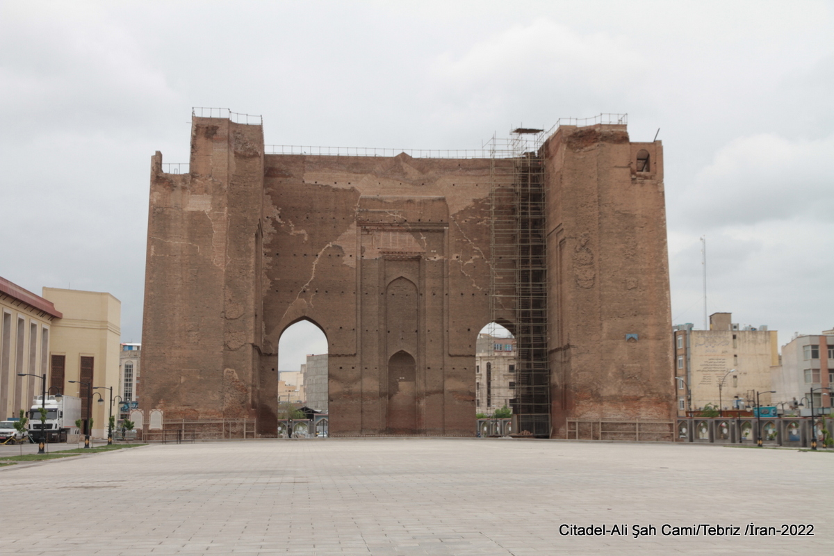 İran gezimizde, kar yağması hariç, her mevsimi yaşadık diyebilirim. İran’a Mayıs ayı içinde gidecekseniz polar, yağmurluk gibi giysileriniz, tişörtlerinizle birlikte bavulunuzun bir köşesinde olmalı derim. Tebriz gezimizi karanlık, puslu ve yağdım-yağacak bir havada yaptık. Tebriz’de, kaynaklarda Arg-e Tebriz, Sitadel, Ali Şah Cami, Ali Şah Mescidi gibi farklı adlarla da bulabileceğiniz yeri ziyaret etmeyi ihmal etmeyin. Geçmişte yaşanan depremler, savaşlar gibi bazı nedenlerle, bugün sadece 30 mt genişlikte, 10 mt kalınlıkta, 25 mt yükseklikte duvarlarıyla abidevi eyvan şeklinde kapı ayakta kalmış. Küçük bir bölümü ayakta kalsa da, bu hali bile eserin zamanında müthiş bir yer olduğu hakkında fikir veriyor.