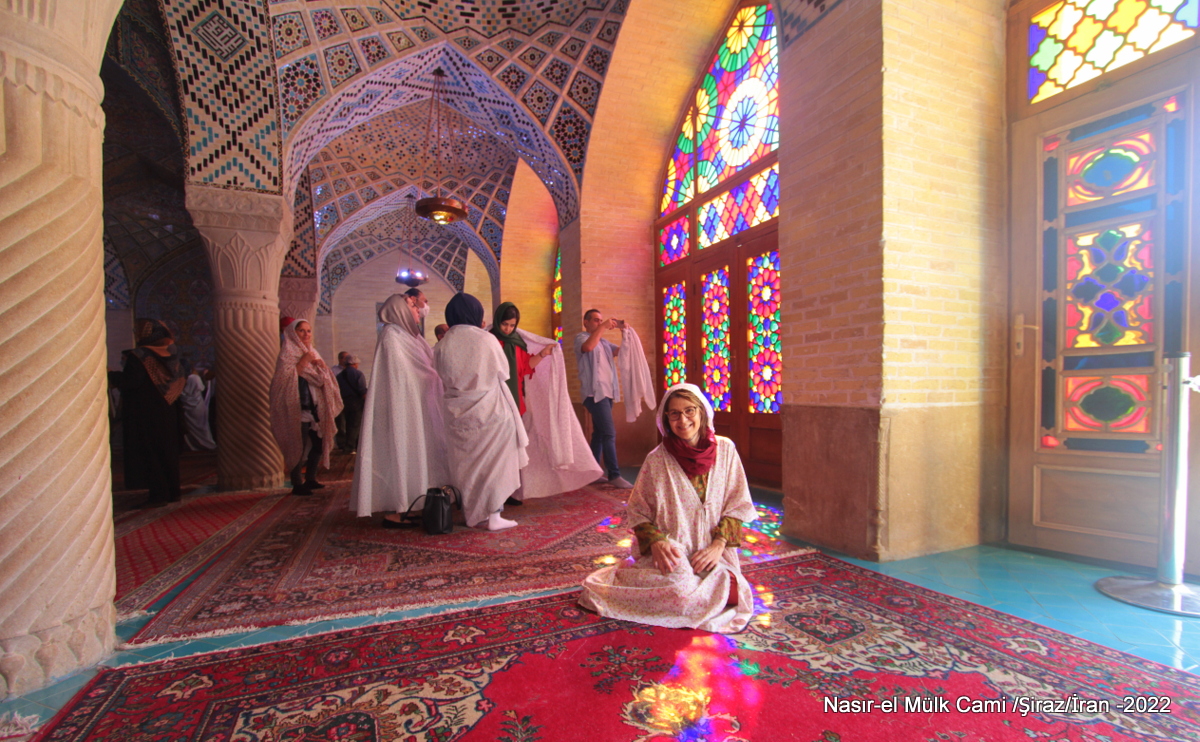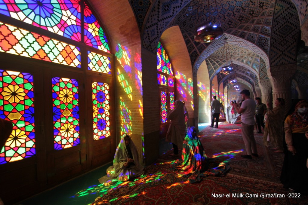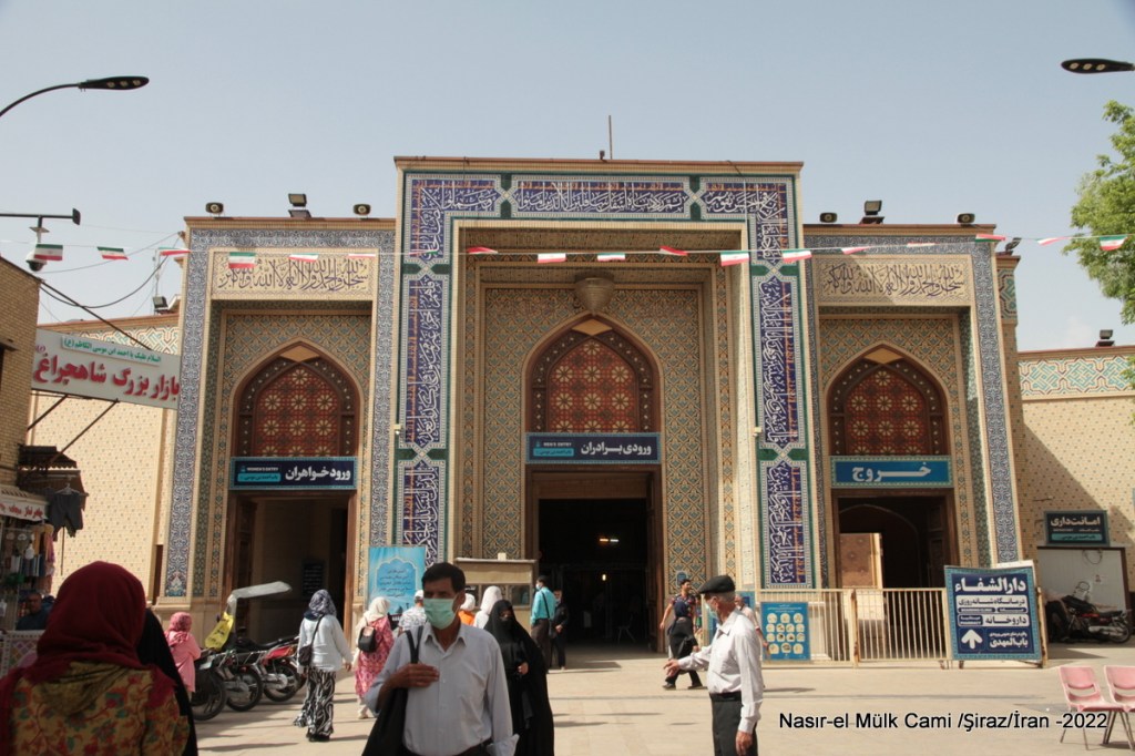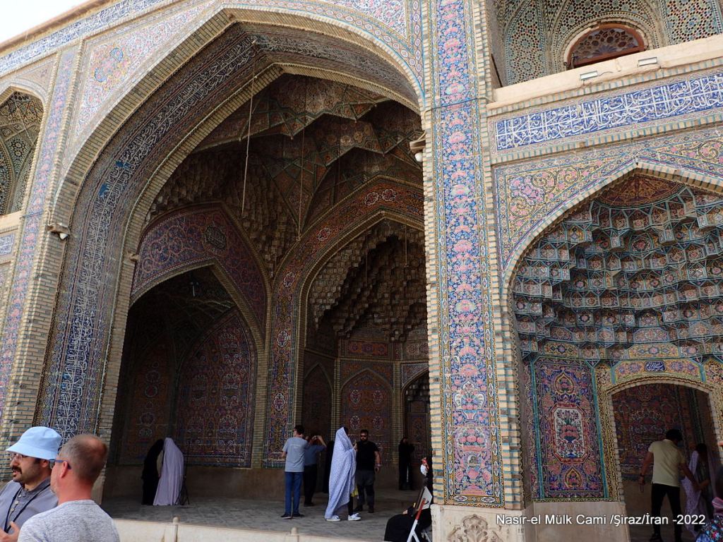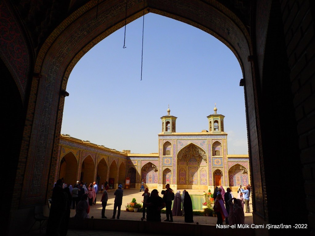 Nasır el-Mülk Cami sabahın erken saatlerinde gezilmesi gereken bir yer. Şiraz’ın bu güzel camisi, sabahın erken ışıklarının vitraylara değmesi ile ortaya çıkan renkli ışık oyunları ile meşhur. Burayı günün diğer saatlerinde daha az kalabalıkla gezersiniz. Ancak caminin özelliği sabah güneşinin vitraylardan süzülüp cami içinde yarattığı ışık oyunları. Bu saatler aşırı kalabalık olabiliyor ve insanlar camların kenarlarında üzerlerine düşen renkli ışıklar altında fotoğraf çekmek için orada oluyorlar. Cami içinde bir saat geçirmişizdir ama ışığın bol olduğu iyi bir yer ve fırsat bulup da, benim konu mankenim eşimin iyi bir fotoğrafını çekmem mümkün olamadı.