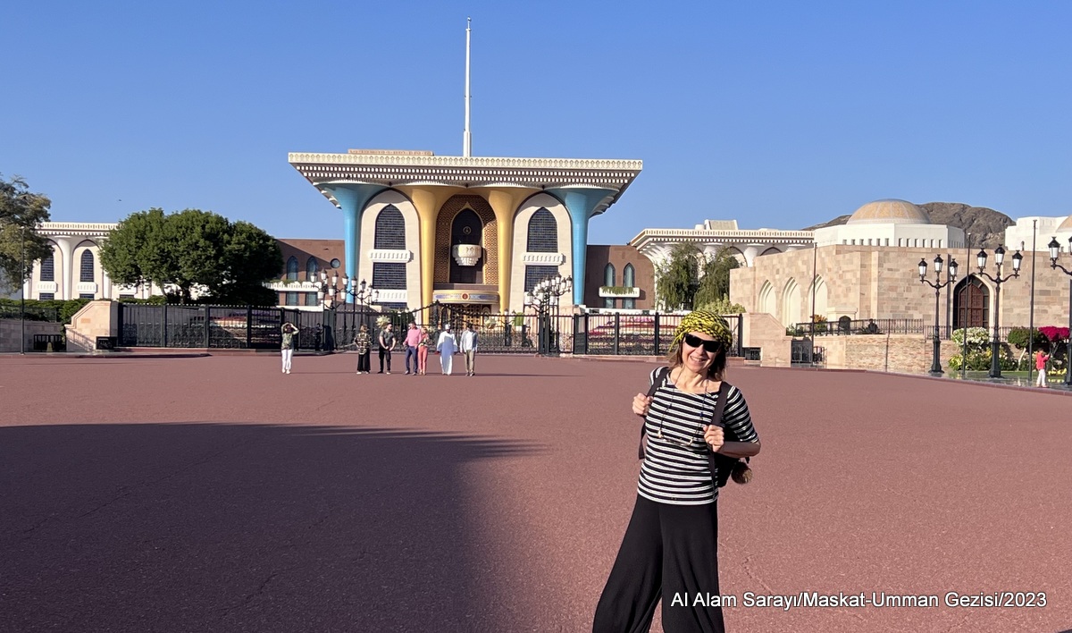 Müzenin kapısından çıkar çıkmaz, sağlı sollu hükümet binaları arasından geçerek saraya doğru, Kasr-ı Al Alam‘a yöneldik. Kelime anlamı “Sancak Sarayı” demek. 200 yıllık olan sarayın bugünkü hali 1972 yılında Sultan Kabus tarafından yaptırılmış. Saray, daha çok seremonilerde ve yabancı devlet adamlarını ağırlamakta kullanıyor. Ziyarete açık değil ama parmaklıklar arasından bile fotoğraf alımına bile karışmıyorlar. Mavi ve altın renkli kapısı çok zarif duruyor. Kesinlikle abartılı bir saray değil. Hayret! Bu kadar zengin bir sultan ol, böylesine mütevazi bir sarayda yaşa!