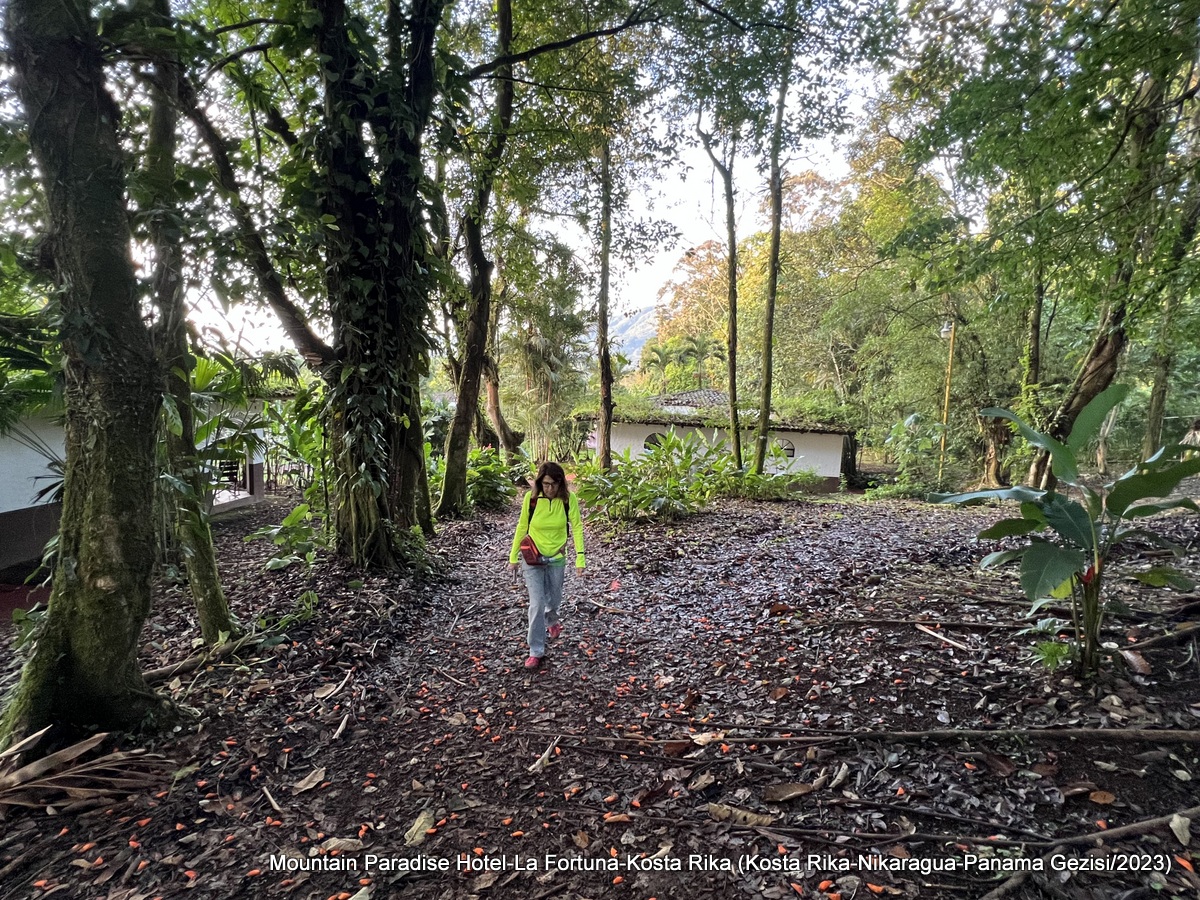 Sabah çok erkenden uyanıp kaldığımız otelin içini gezdik. Dün akşam karanlık ve yağmur yüzünden tesisi (Mountain Paradise Hotel) gezememiştik. Sabah açık ve yağmursuz bir hava nedeni ile tesisin tüm güzelliği ortaya çıktı. Arenal Volkanı sabahları gökyüzünde bulut olmadığından tablo gibi karşımızda duruyor. Bu volkanın tepesinde olan duman mı yoksa bulut mudur? O an anlamamıştık.