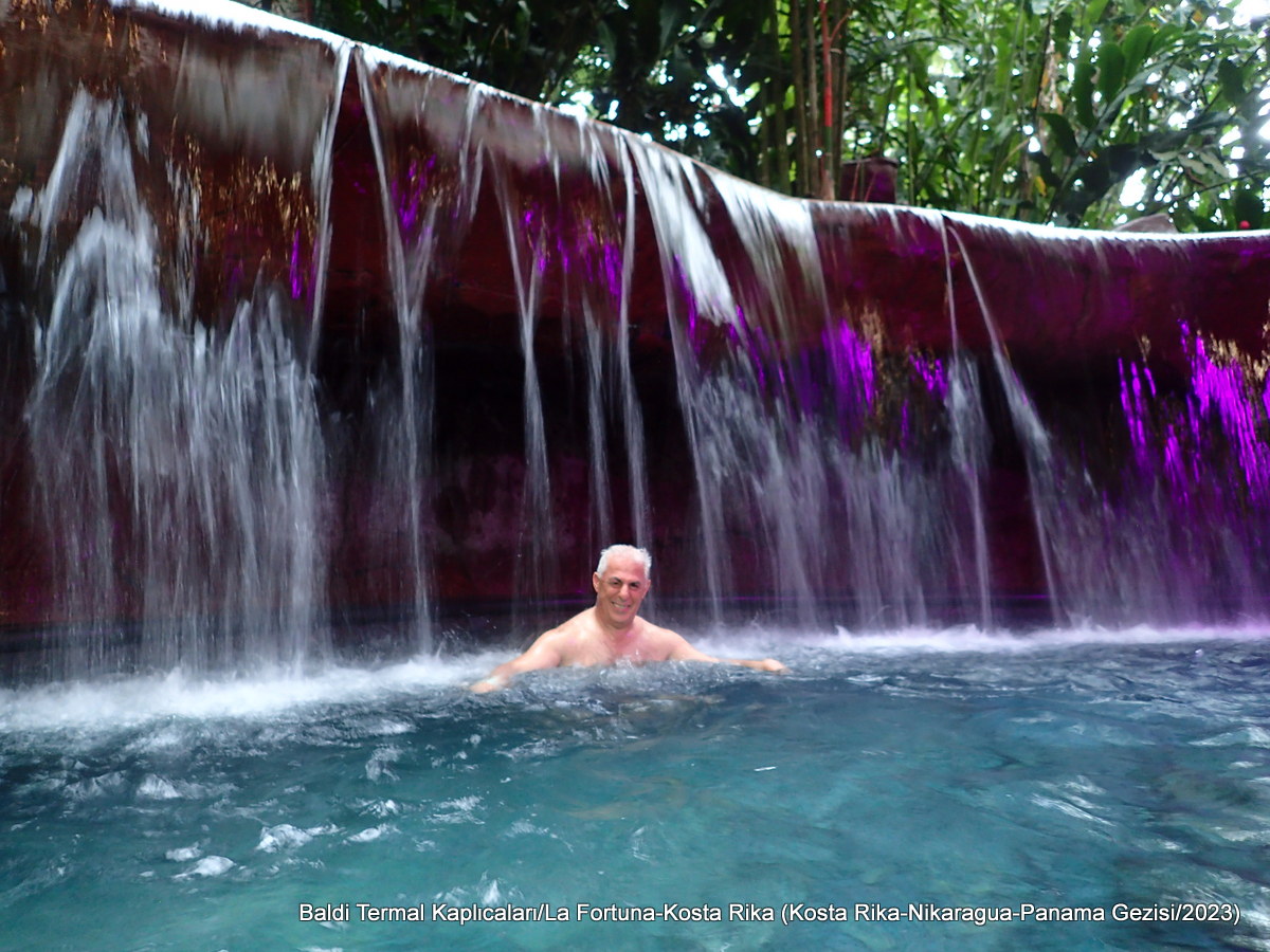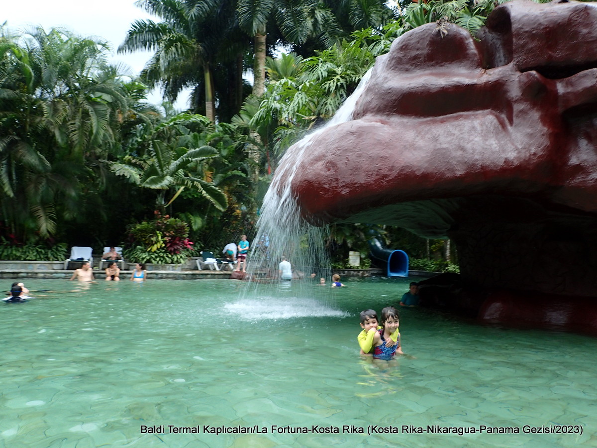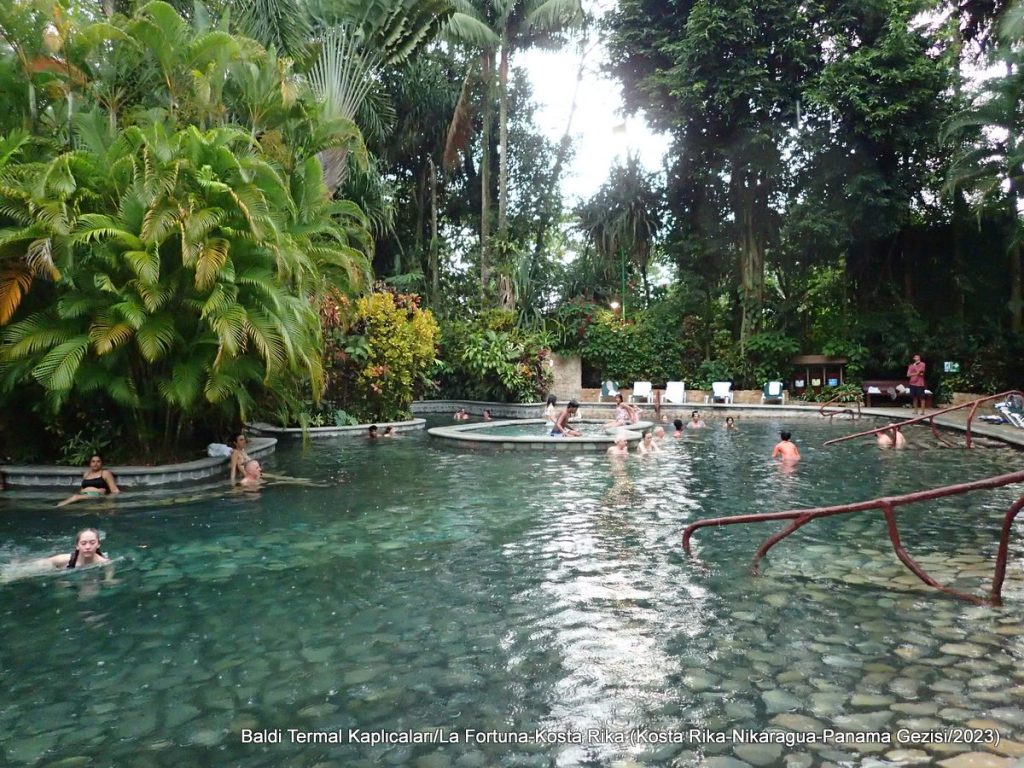 La Fortuna bölgesinde çoğu özel tesis içinde kalan çok sayıda irili ufaklı kaplıca var. Bunlar arasında en meşhuru Tabacon adlı olanı. Bu aynı zamanda en pahalı olan kaplıca ve buna biz o gün yer bulamadık. Giriş ücreti yaklaşık 100 USD. Biz de Baldi adlı kaplıcaya yer ayırttık. Burası günlük 45 USD. Kaplıca suyunun ana kaynağı yağmur suyunun toprağın derinlerine inip magma sıcaklığı ile ısınması. ParadiseHot Springs Resort ve EcoTermales adlı başka kaplıcalar da var.