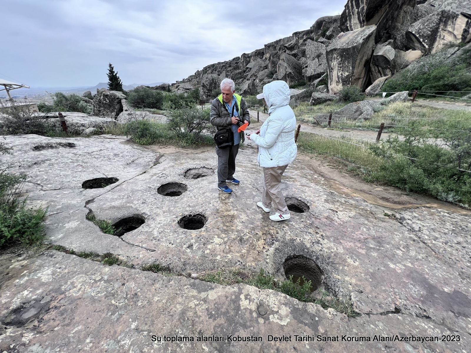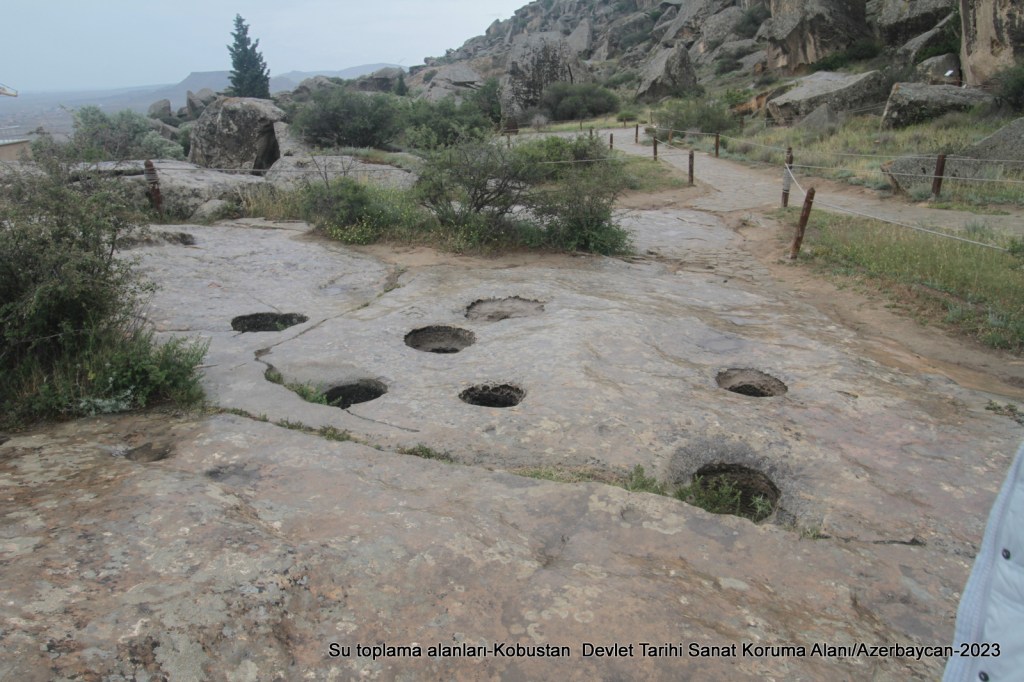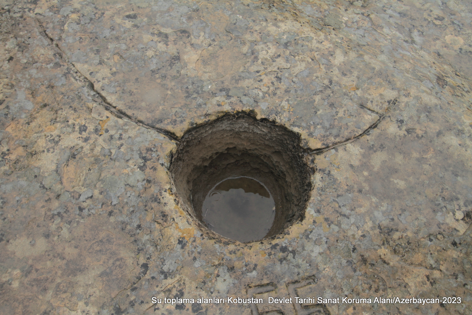 Alandan çıkışa doğru bir başka ilginç bulduğum şey ise Kobustan kayaları ve büyük taş parçaları üzerinde çok sayıda yarımküre şeklinde açılmış kase çukurlardı. Bu alanda yaşayan erken insanlar mağaraların yakınında yere gömülmüş büyük ve düz kayaları taşlarla döverek oymuşlar. Büyük su havuzlarını (ya da kaseleri) yapmışlar.