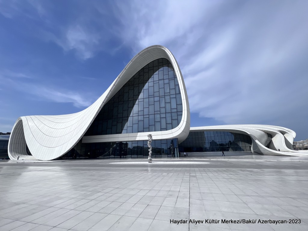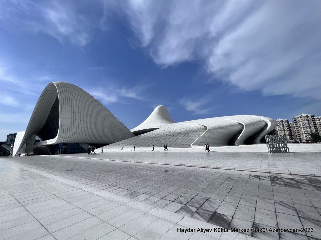 Haydar Aliyev Kültür Merkezi Bakü’nün diğer simge binalarından. Bina 2012 yılında tamamlanmış. Mimarı Irak kökenli İngiliz kadın mimar Zaha Hadid. Külliyenin projesinde neredeyse hiç düz çizgi kullanılmamış.