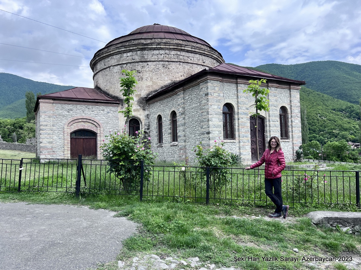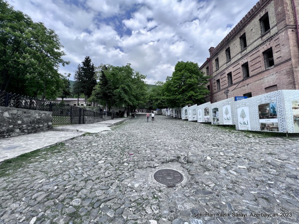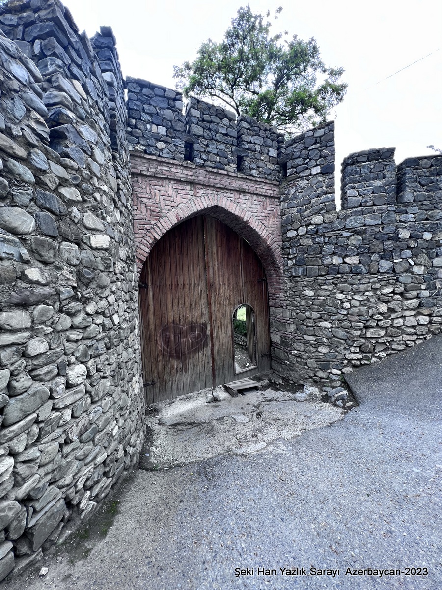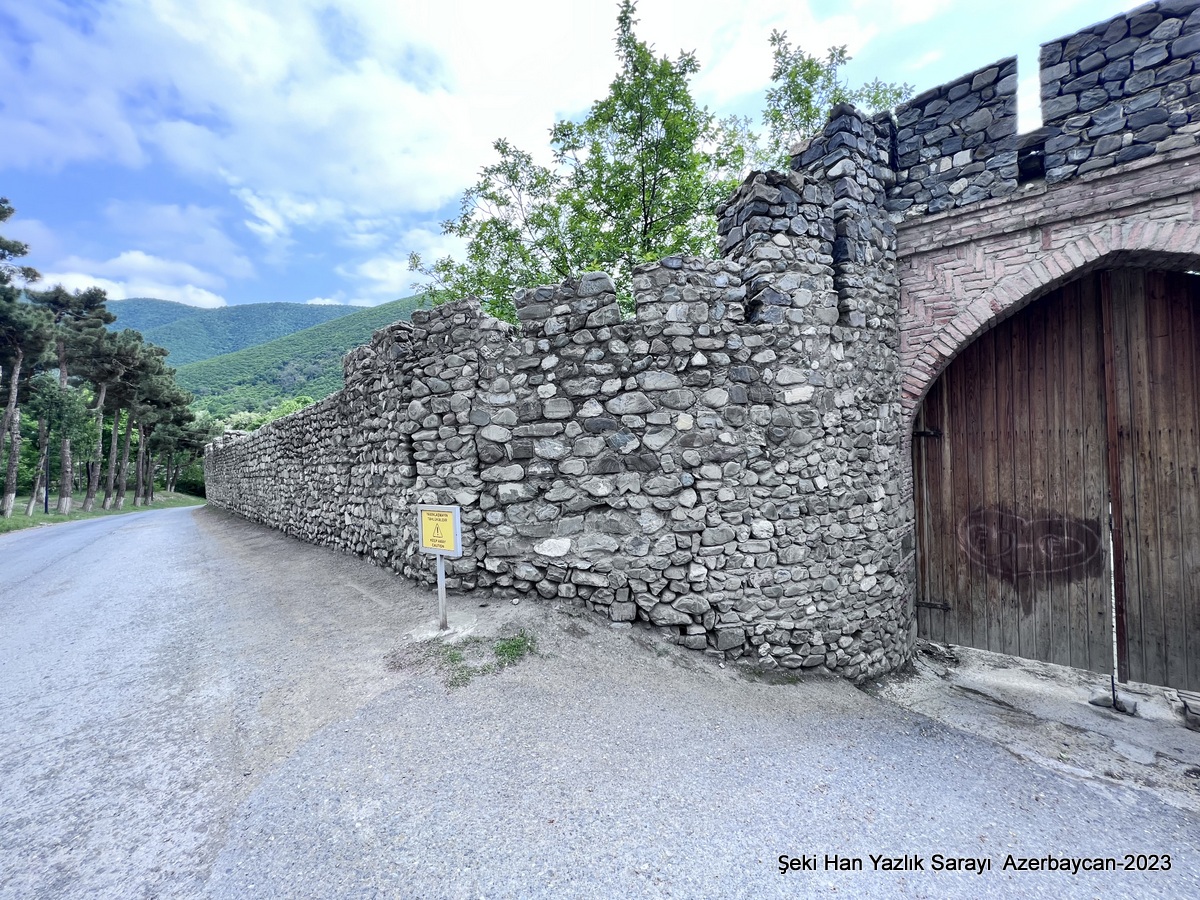 Şeki’ye girdikten sonra doğrudan Nukha Kalesi surları içindeki Şeki Hanlığı Yazlık Sarayı‘nın bulunduğu tarihi merkeze gittik. Şeki’nin yükseklerinde olan 283 hektarlık alan, UNESCO Dünya Kültür Miras Listesi içerisinde bulunuyor. Yani biz bu gezimizde Azerbaycan’ın UNESCO Dünya Kültür Listesi içinde bulunan üç yerini de gezmiş olduk. Nukha Kalesi, Şeki Hanları Yazlık Sarayı, Yuvarlak Tapınak (Nukha Kutsal Kilisesi) aynı alan içindeki yerler.