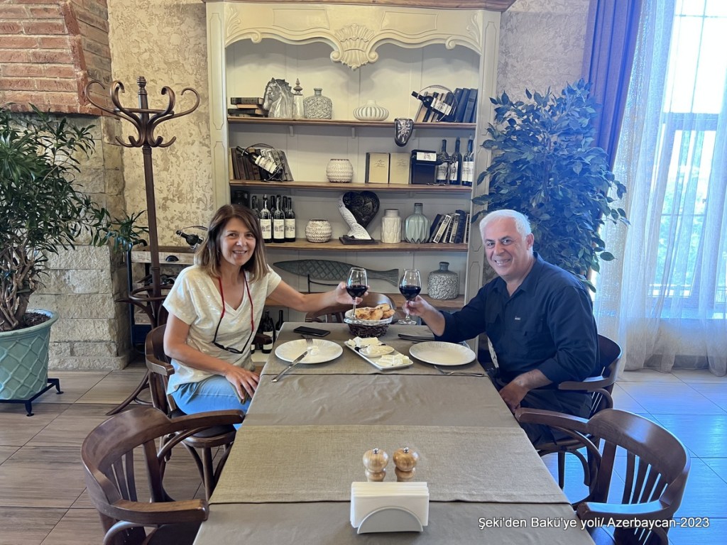 Bu tesiste yöreye ait bağlardan çeşitli şarap örneklerini denemek şansımız oldu. Her şarap bardağı tadımı ücretli. Hanım bir tane seçti, ben bir tane seçtim. Bir masaya oturduk ve güzel bir peynir tabağı eşliğinde şaraplarımızı yudumladık. Bu aslında güzel geçen Azerbaycan gezimizin baş başa kutlaması da oldu. Mekan çok güzel. Şarapları ise benim damağımın tadı değil. Aslında Azerbaycan’da şarapçılığın milattan önce 2000’li yıllara giden geçmişi mevcut. Dağlık Karabağ, Nahçıvan, Gence ve Şamahı önemli şarap üretim yerleri.