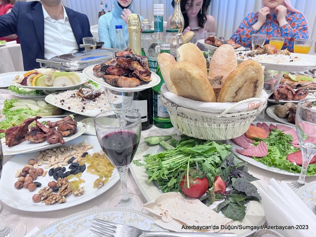 Salonda kız tarafı olarak yerimizi aldık. Masa üstünde soğuk yiyecek ve içecekleri görünce meşhur Azerbaycan düğün ikramlarının nasıl olabileceğini tahmin etmeye başladım. Masalara bol soğuk meze, votka, alkolsüz içki önceden konmuş oluyor, bunları garsonlar servis ediyorlar. Sürekli ara sıcaklar getiriyorlar. Tüm düğün boyunca masada ikram eksilmedi, garsonlar boyna çalıştı. Tavuktan, bıldırcın etine kadar durmadan yiyecek geldi durdu.
