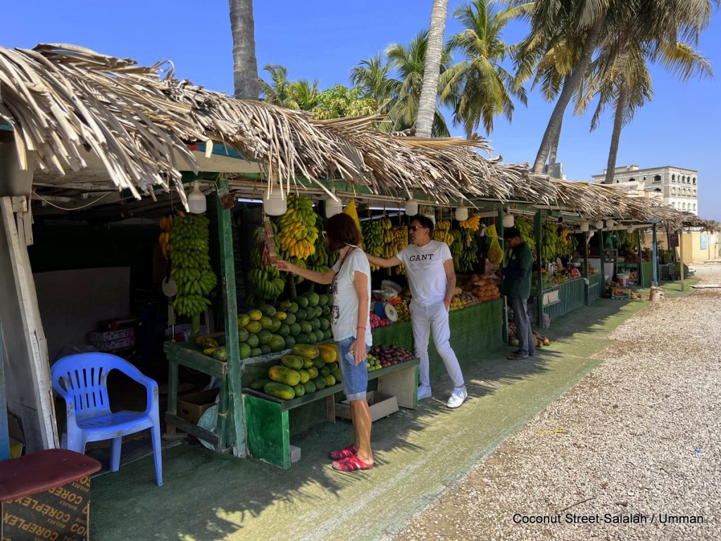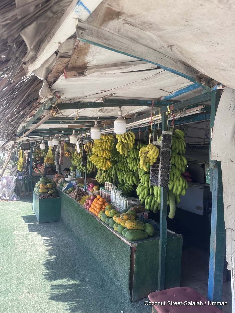 Salalah tropikal meyve bahçeleri ile ünlü. Kokonat Caddesi, tahta kulübeler içinde her türlü tropikal meyvelerin satıldığı bir yer. Burada sıralanmış olan kulübelerdeki satıcıların birinden meyve satın aldık. Bir kilo muz için 300 Baizas (yaklaşık 24 TL) ödedik. Kokonat Caddesi’nde, otelde yediğimiz öğle yemeğinin hemen sonrası olunca pek bir şey denemek istemedik. Ama tezgahlar denemek isteyebileceğiniz bildiğiniz ve bilmediğiniz bir sürü meyve ile doluydu. Hiç bir şey denemeseniz ve yemeseniz dahi fotoğraf çekmek için bile gidilebilecek bir yer.
