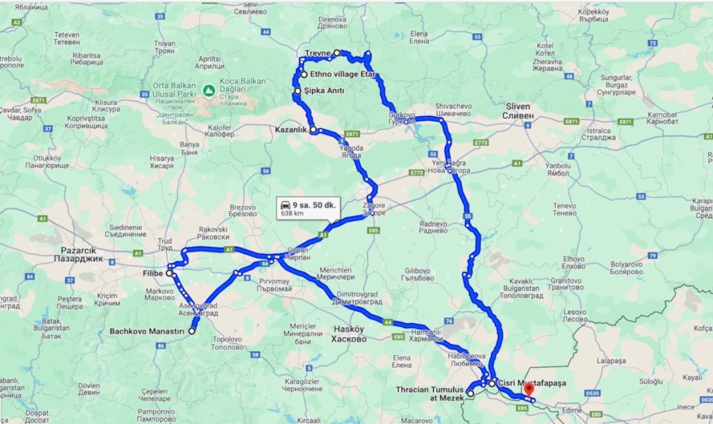 İlk güne sığdırdığımız rotamızdaki diğer yerler sırası ile Mezek Köyü‘ndeki Trak Mezarı, Mezek Köyü Kalesi, Aleksandrova‘da Trak Mezarı, Filibe (Plovdiv) yakınlarındaki Asen Kalesi ve Backhova Manastırı oldu.