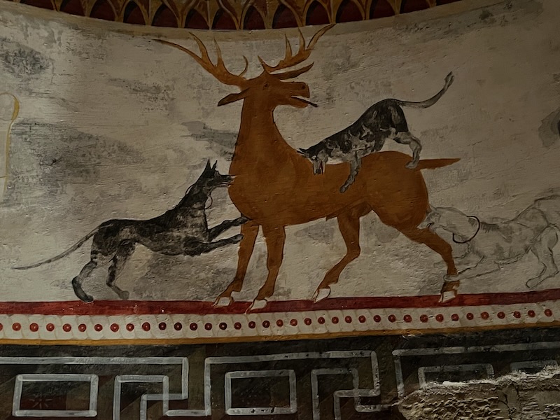 Ana odadaki fresk, atlı bir avcı tarafından bir yaban domuzunun saldırıya uğradığı ve çift balta kullanan çıplak bir adamın yer aldığı bir av sahnesini tasvir ediyor. Çift baltanın kraliyet gücünü temsil ettiği, çıplak adamın ise Zalmoxis‘i yani Zeus’a karşılık gelen Trakyalı Güneş Tanrısını temsil ettiği yorumlanıyor.