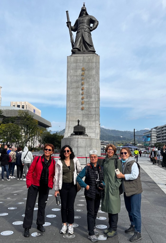 Törenin başlamasına daha yarım saat var ve henüz sarayın geniş avlusunda pek kalabalık yok. Bir daha gündüz gözü ile Gwanghwamun Meydanı‘nı, dolayısıyla ünlü Amiral Yi Sun-sin‘in ve Büyük Kral Sejong‘un heykellerini ziyaret etme şansını bulamayacağız korkusuyla tören başlamadan önce meydanı hızlıca gezmeyi gruba teklif ettim. Böyle de yaptık. Neredeyse koşar adım sarayın kapısından, heykellerin bulunduğu meydana doğru yöneldik.