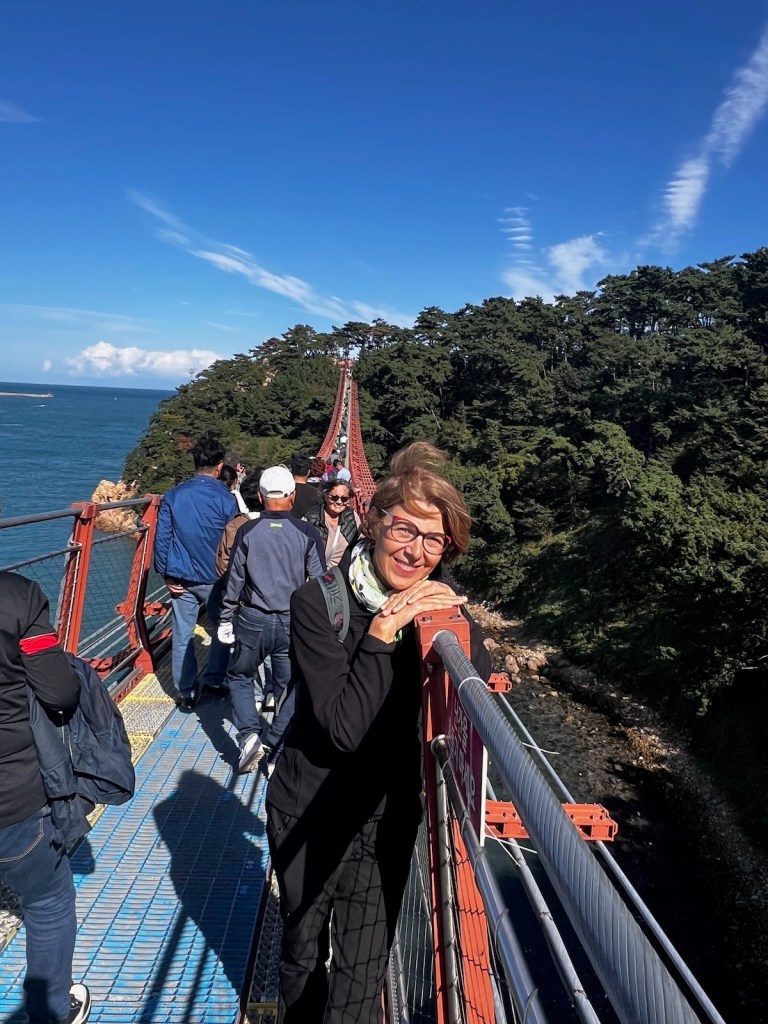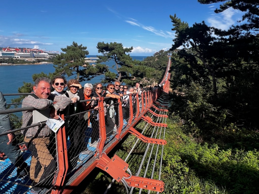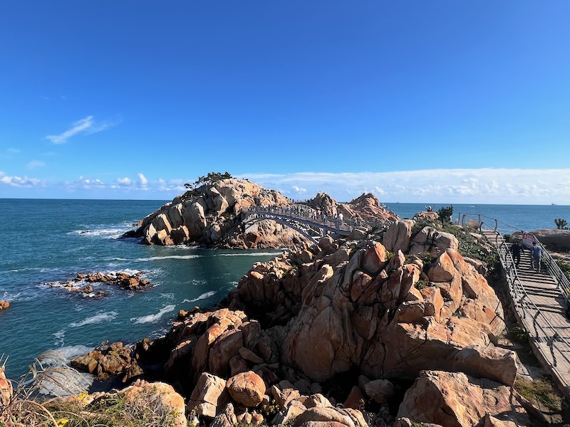 Yolun sonunda, denize uzanan Daewangam Kayası’na bağlanan bir yaya köprüsü var. Bu köprüden geçip kayalıklara ulaşmak parkın en etkileyici noktası. Günün bu saatinde ortamda çok gezgin var.