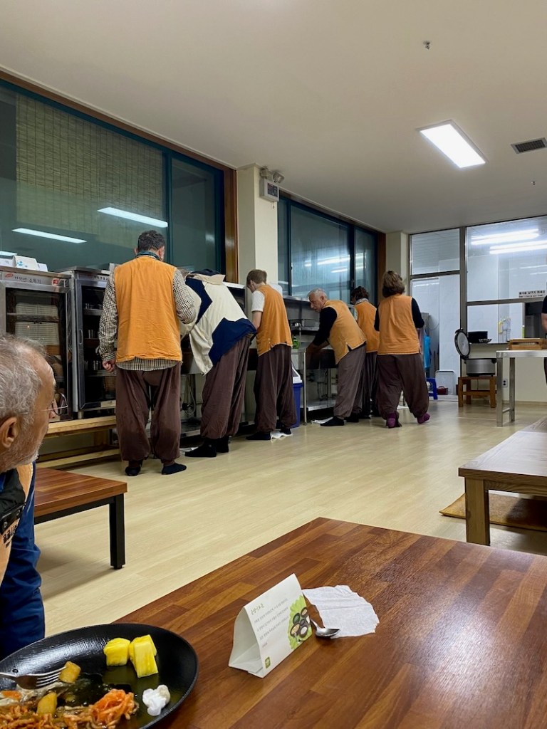 Konaklama yapacağımız tapınakta hem akşam yemeği ve hem de kahvaltı yapılacak. Tapınak yemekleri sadelikleri ile meşhur. Konaklama öncesinde yemeklerin tadının da, tuzunun da pek olacağını sanmıyordum. Tapınakta aldığımız yemekler sonrasında bu düşüncemin doğruluğu tescillendi. Bu nedenle tapınağa girmeden önce yiyeceğiniz güzel yemek, sizi ertesi güne kadar idare etmeli. Öğlenleyin güzel bir et galbi yedik. Galbi-jjim Kore usulü haşlanmış dana kaburga yemeği. Galbi, Korece kaburga anlamına geliyor. Domuzdan da galbi yemeği oluyor tabii ki.