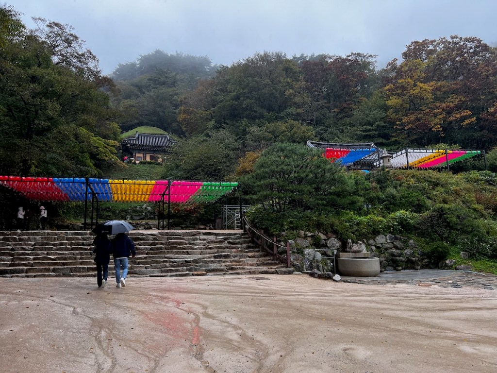 Düz bir yol yürüyüşü sonrasında renkli fenerlerin bulunduğu bir alana ve tapınağa ulaştık. Buradan merdivenlerle yukarıdaki Seokguram Mağara Tapınağına çıkılıyor.
