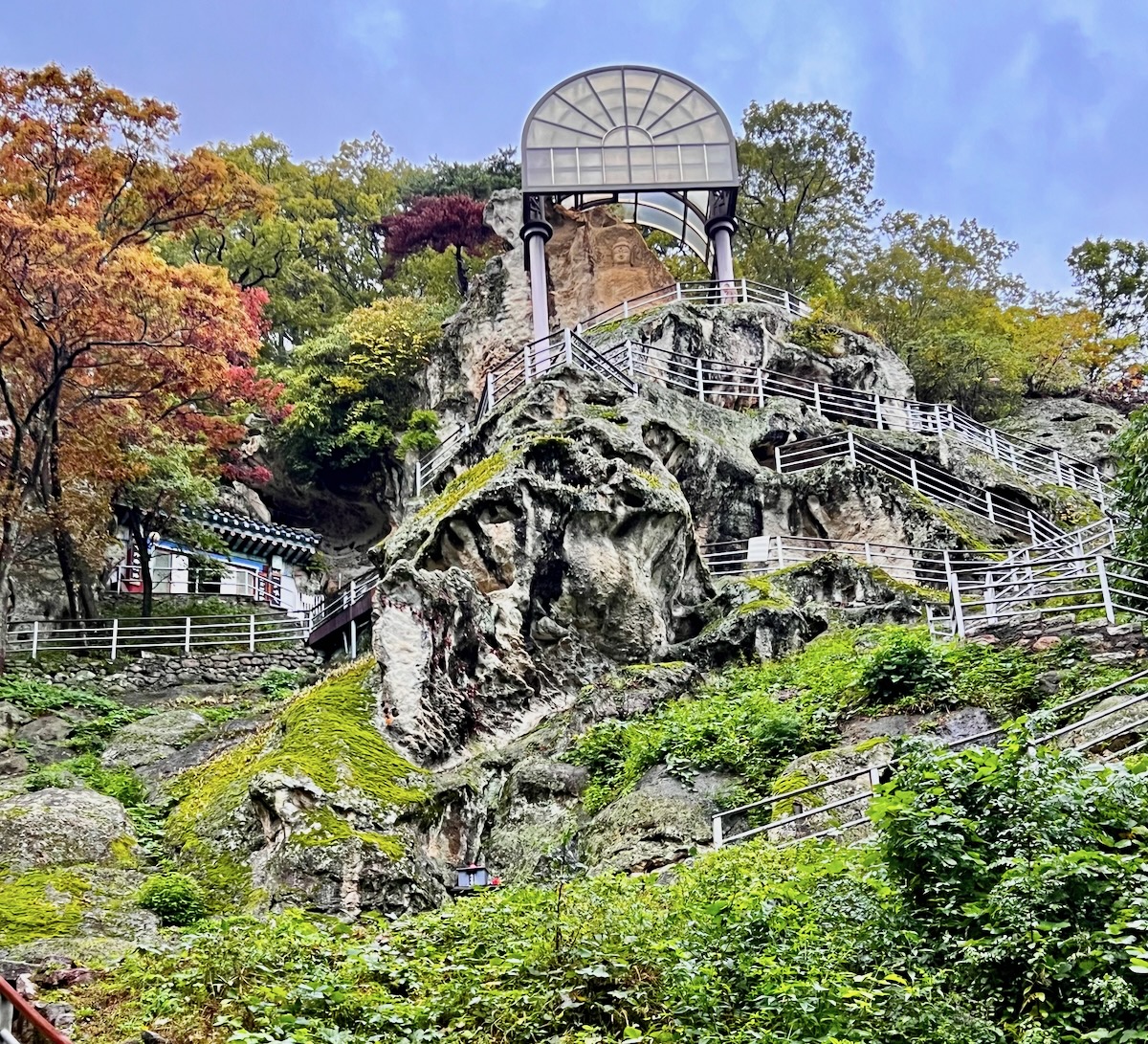 O dönemde yaygın bir korku olan, sinir bozucu Japon işgalcilerden Kore’yi koruması için heykel doğuya bakacak şekilde konumlanmış. Buda ve çevresindeki havari heykelleri camekanın arkasıda korunuyor.