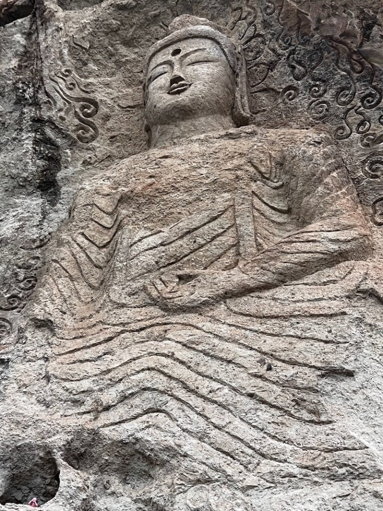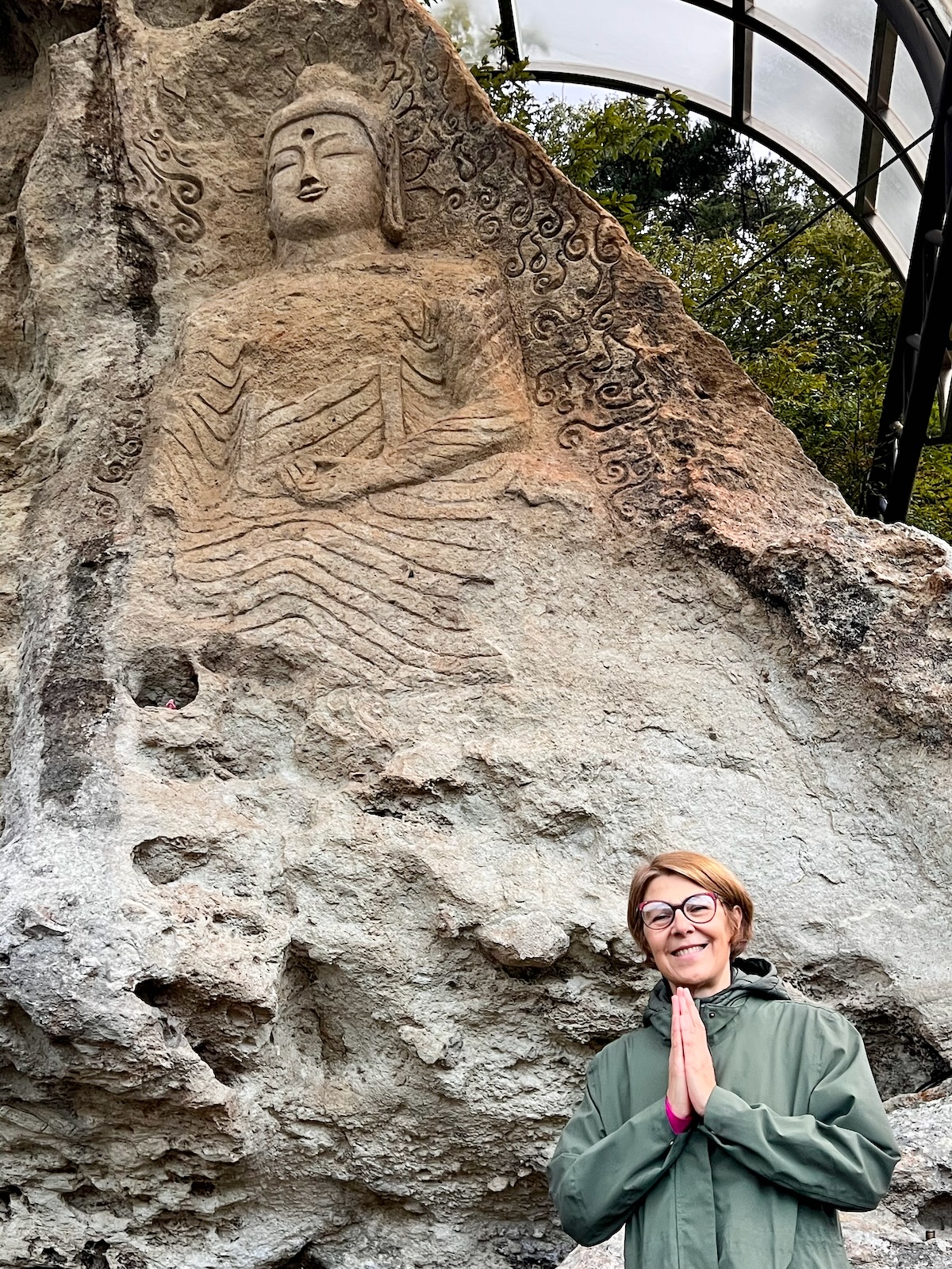 Öğleye kadar tapınakta zamanımız var ama yapacak şeyimiz yok denecek kadar az. Kahvaltı sonrasında kayaya oyulmuş Oturan Buda heykeline kadar hep birlikte tekrar yürüdük. Bu sefer hava güneşli. Ortam dün olmayan ama bugün olan güneş ışınları ile çok güzel gözüküyor.