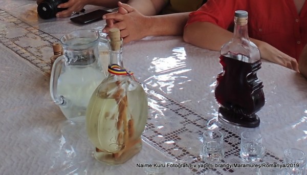 Bu ev yapımı içkilerin özel bir de şişesi oluyor galiba. Ev yapımı kanyakların hep aynı türden şişelerde getirildiğini gördüm. Hem kaldığımız evde ve hem de Barsana Köyü ziyaretimizde gittiğimiz evde bize hem içki damıtma aletlerini gezdirdiler ve hem de içkilerinden tattırdılar. Tahmin edeceğiniz gibi bir hayli keskin tatları var. Kaldığımız pansiyonda her akşam yemek öncesi Țuică ikram ettiler. Ama Romanya’da içtiğim en güzel ev yapımı içki Bucovina Bölgesinde içtiğim, Bayan Elena Coca’nın yaptığı kimyon likörüydü. Yeri gelince bahsederim.