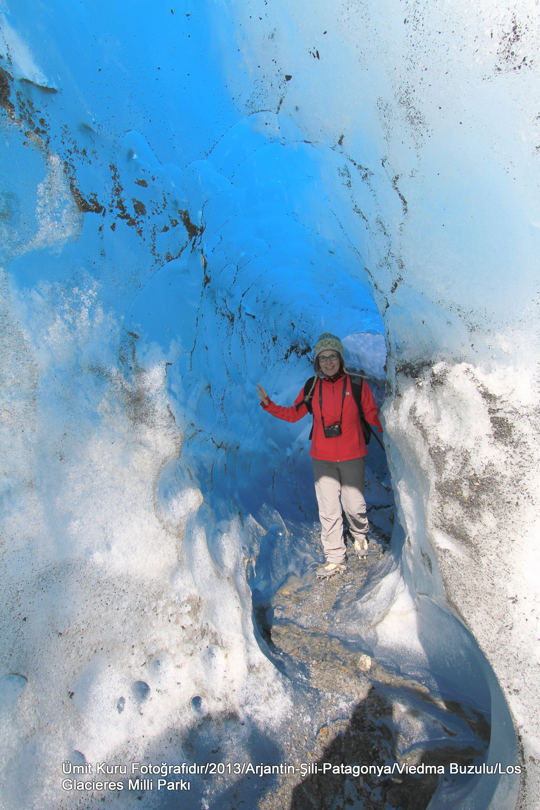 IMG_8150Buzul üstüne çıktığımız andan itibaren iki gruba ayrıldık. Çoğunluğunu oluşturduğumuz bizim grupta 4 tane rehber var. Bizden bir çizgi üzerinde hareket etmemiz istendi. Önce buzulun şekil verdiği kayalardan tırmanarak buzula doğru kısa bir yürüyüş yaptık. Buzula ulaşır ulaşmaz, bize eşlik eden rehberler, her birimizin ayakkabılarına uzun çivileri olan bir aparat monte ettiler. Bu işlemden sonra buzul üzerinde yürümeye başladık.  Dilim dilim kesilmiş gibi buz tepelerinin üzerinde yürüyüşlerimizi yaptık. Bazı yerlerde büyük kaya blokları vardı. Bazı alanlarda içi su dolu küçük boşluklar var ve bazı alanlarda da su kanalları oluşmuş. Sonunda bir buzul mağarasına götürdüler bizi. Bu mağaranın yaklaşık 5 metre kadar gidebildiğimiz bir derinliği vardı ancak göremediğimiz mesafelerden ve aşağılardan gelen akan su sesi var ve belli ki mağaranın derinliği de uzunluğu da tahminlerimizden çok fazla.  IMG_8301