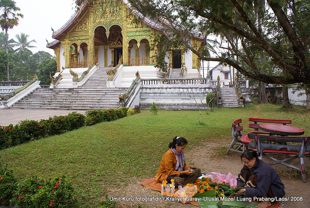 Burada yerel rehber Budizm hakkında biraz bilgi verdi. Bu sırada ellerinde tencerelerle turuncu giysili rahipler dışarıdan geldiler ve tapınağa girdiler. O anda ne olduğunu anlamamıştık, sonra ki günlerde anladık ki bu olay Laos’da her sabah erken saatlerde tekrarlanan ve Laos’a gelen turistlerin hiçbirisinin kaçırmaması gereken bir merasim. Rahipler ellerinde tencereleri ile tek sıra halinde yürüyüp, yemek dolu tencereleri ile rahipleri bekleyen halktan yemek bağışı kabul ediyorlar. Biz meğerse bu olaydan dönen rahipleri görmüşüz. Topladıkları yemekleri tapınakta paylaşıp yiyorlardı. Luang Phrabang’da bu rütieli her gün saat 5:30 da kalkıp seyrettim. Mutlaka şahit olmalısınız.