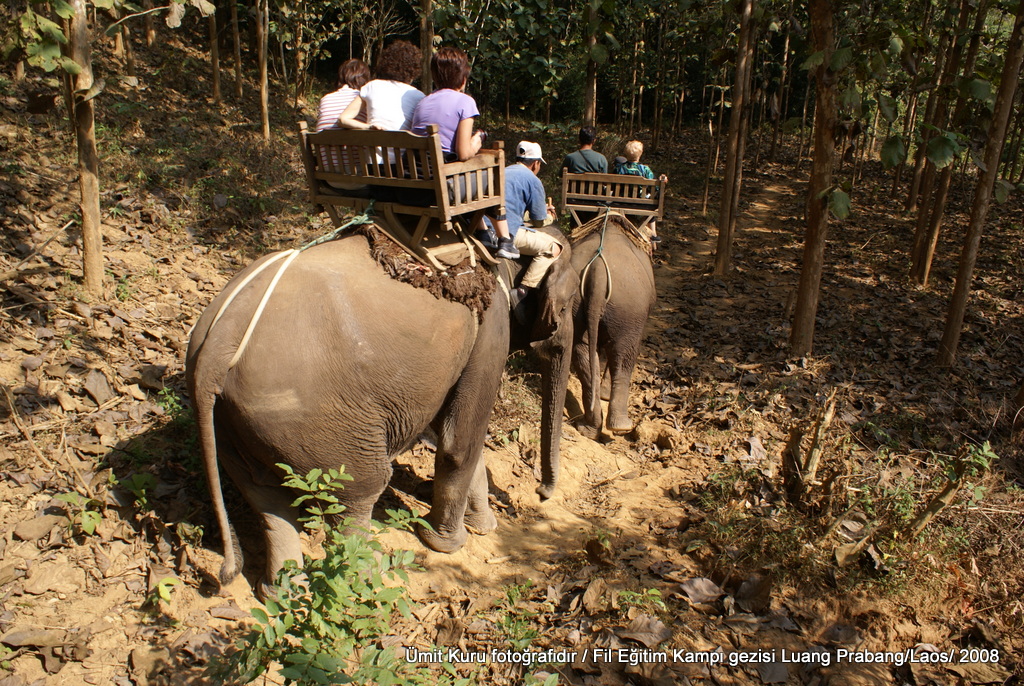 Gelelim Fil kampına; Laos’un ülke olarak eskiden bilinen ismi bir milyon fil ülkesi. Saymışlar mı? Zannetmem, ama ne kadar çok fil olduğunu iyi ifade etmişler. Fil eskinin taşıma aracı, savaş aracı, buldozeri, yani her şeyi. Bu kamp şehir merkezinden 15 km dışarıda. Yolu rezalet, içimiz dışımıza çıktı. Arabada biz beş kişi, 70’lerin üstünde bir teyzem ve yanında bir genç adam (Kanada ‘dan gelmişler) bize eşlik ediyor. Teyze, herhalde file binmez dedim ama aslanlar gibi bindi.