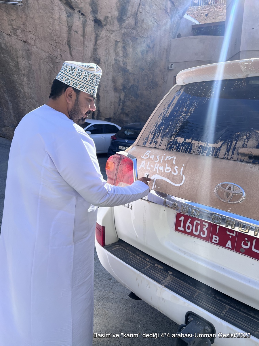 Önce sizlerle Umman’da 4*4 araçla gezmek hakkında bazı bilgileri paylaşmam lazım. Umman’ın iç kısımlarına ve vadilere, çöllere sakın ola küçük binek araçlarla kendi başınıza gezi planlamayınız. Umman’da kıyı kesimindeki Salalah’a kadar uzanan düz ve birkaç şeritli yollara güvenmeyin. Vadi ve çöl yolları düzgün değil. Bu gezilerin tadına varmak istiyorsanız illaki 4*4 araçla geziyor olmalısınız. Hem çölde ve hem de vadilerde, 45 derece eğimli yollarda kullanmam ve o heyecanı yaşamam için Basim arabasını verdi. Ama bu bizim gibi asfalt şoförlerinin işi değil. Bir 4*4 araç bagajı, kabin boy valizden biraz büyükçe 4 valiz alabiliyor ve arka koltuğa 3, ön tarafa 1 kişi toplam 4 kişi grup halinde gezilebiliyor. Araçta 3 kişi gezmek belki maliyeti biraz arttırır ama gezinin konforu daha fazla olacaktır.