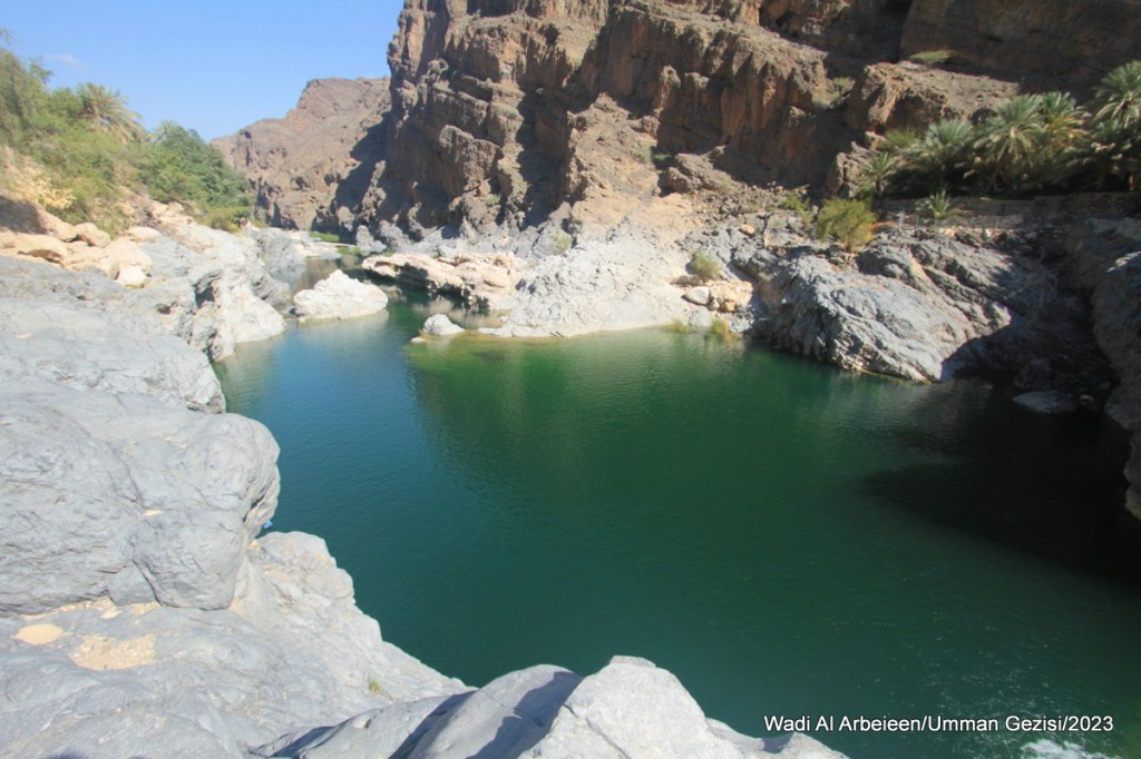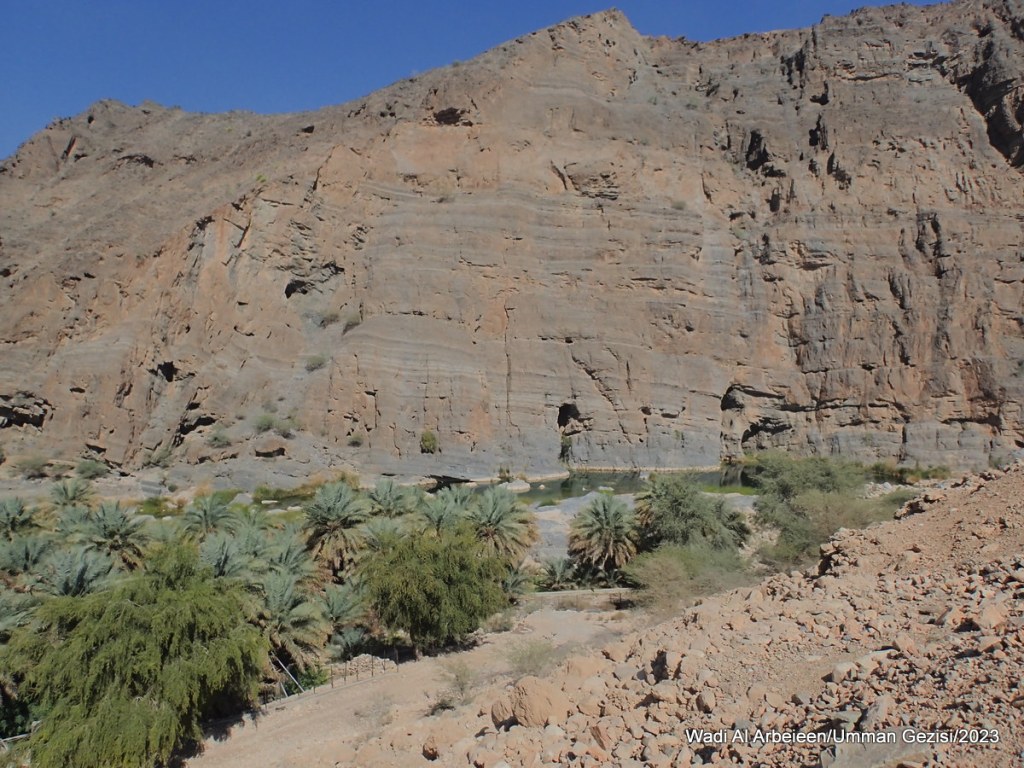 Wadi Al Arbeieen diğer vadilerde de olduğu gibi hurma ağaçları ya da bazen muz ağaçları dışında ağaç ve yeşillik göremeyeceğiniz, kendine has kaya formasyonuna sahip bir yer. Beklenmedik yerlerde yeryüzüne çıkan sular, ortamın havasını bir anda değiştiriveriyor.
