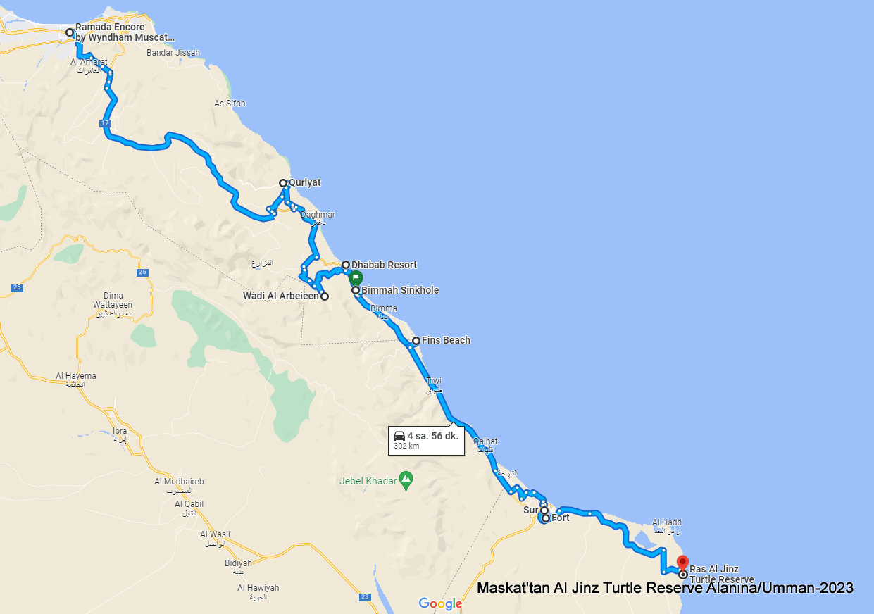Bugün artık Maskat’taki otelimizden ayrılıp Umman’ın diğer bölgelerine doğru geziye başlıyoruz. Maskat’tan başlayarak önce Koryat (Quriyat), sonra Wadi Al Arbeieen, Bimmah Sinkhole, Fins Beach, Sur Şehri, Ras Al Hadd gezilerini yapıp en son olarak da Ras Al Jinz Kaplumbağa Rezerve Alanında geceleme yapacağız. Bu gecenin son aktivitesi ise kalacağımız otelde kaplumbağaların karaya çıkıp yumurtlamalarını ya da bebek kaplumbağaların yumurtadan çıkmalarını gözlemek olacak. Son kısım kaplumbağaların yumurtlama mevsimi dışında olduğumuzdan şansa kalmış bir bölüm. Toplamda 300 km’yi bulan ve hiç durmadan gitsek 5 saati bulacak olan uzun bir yolumuz var.